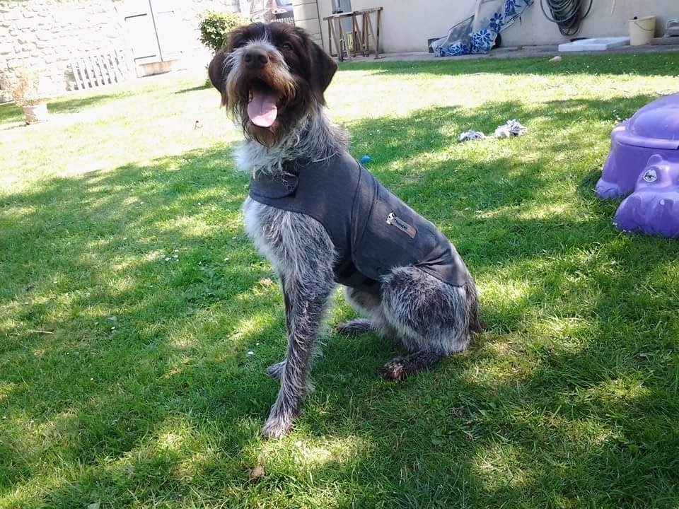 | Dire merci | Je lui mets quand l'orage commence à gronder au loin et je lui enlève quand elle se calme après l'orage. Il faut savoir qu'avant d'avoir le tee-shirt, elle était en panique pendant et après l'orage, ça pouvait durer des heures. Avec ça elle se calme beaucoup plus vite. |