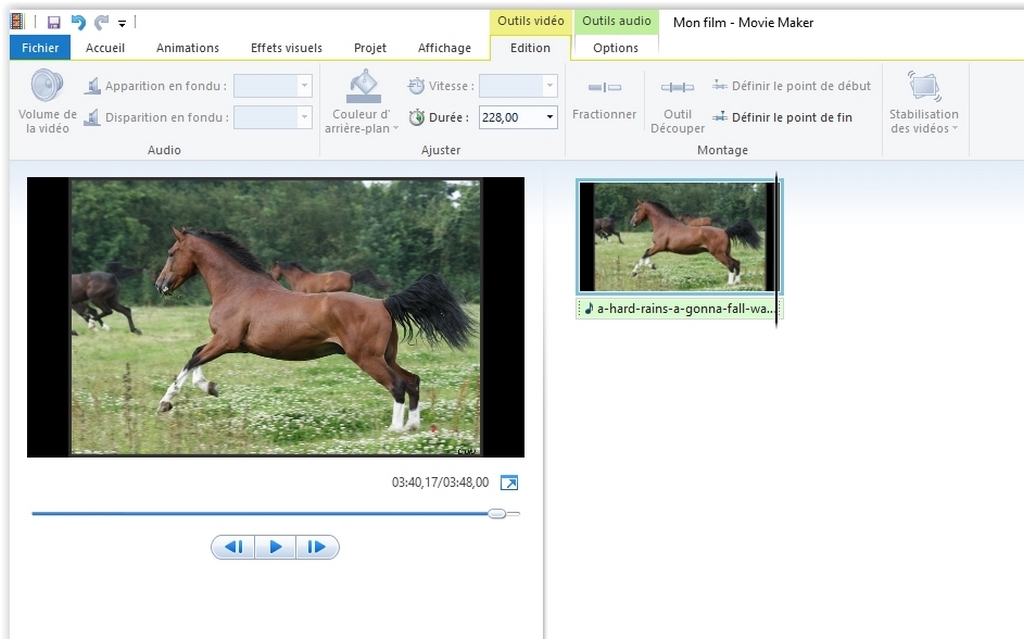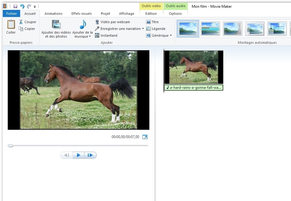 | Dire merci | en fait tu mets ton fichier en musique d'accompagnement de la vidéo Et comme tu n'as pas de vidéo, tu choisis une image dont tu règles le temps d'apparition en guise de vidéo !! je te fais des captures d'écran pour te montrer tu mets une photo ![]() tu ajoutes de la musique ![]() ![]() ensuite tu cliques sur "édition" et tu remplaces le nombre de secondes par le nombre de celles que dure ton morceau de musique et tu n'as plus qu'à enregistrer la vidéo ![]() |