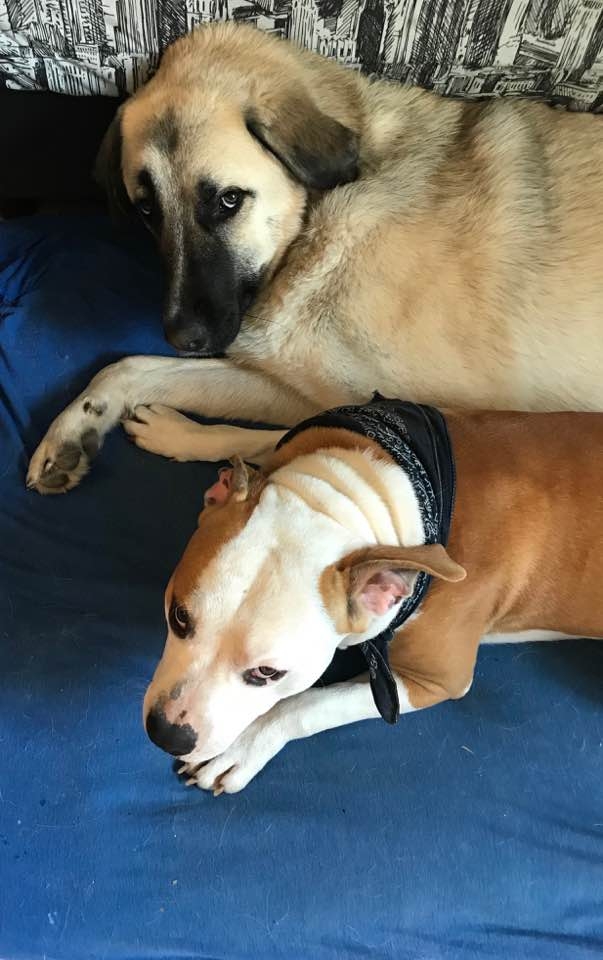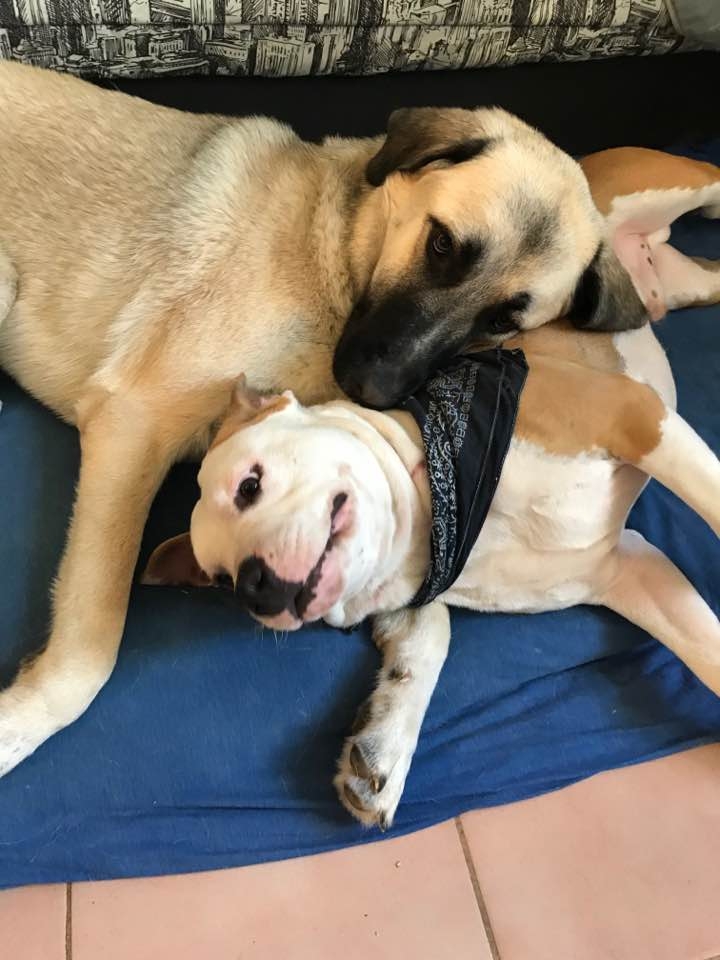 | Dire merci | Ca y est!... Moogli a un pote!!!... On cherchait une fille mais ma grande a craqué pour un pur staf pour elle. Du coup, comme elle est a la maison, le chien est avec nous ![]() Il a 11mois et c'est un amour. Il vivait en groupe de plusieurs mâles, du coup, il sait respecter les autres chiens. ![]() ![]() ![]() Ils se font des parties de jeux incroyable! |