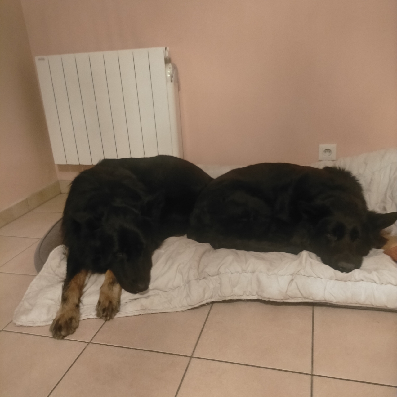 | Dire merci | Les nôtres sont là plupart du temps dehors ensemble. Ils rentrent avec nous quand il ne pleut pas. Mais canapés interdits et chambres bien évidemment car je ne supporterais pas de voir des poils sur mon lit. Epona , elle vivait dans la maison. Elle avait des dodos partout sauf chambres . Mais , elle , elle était toute petite , poils courts, et je pouvais la laver dans l'evier si besoin. |