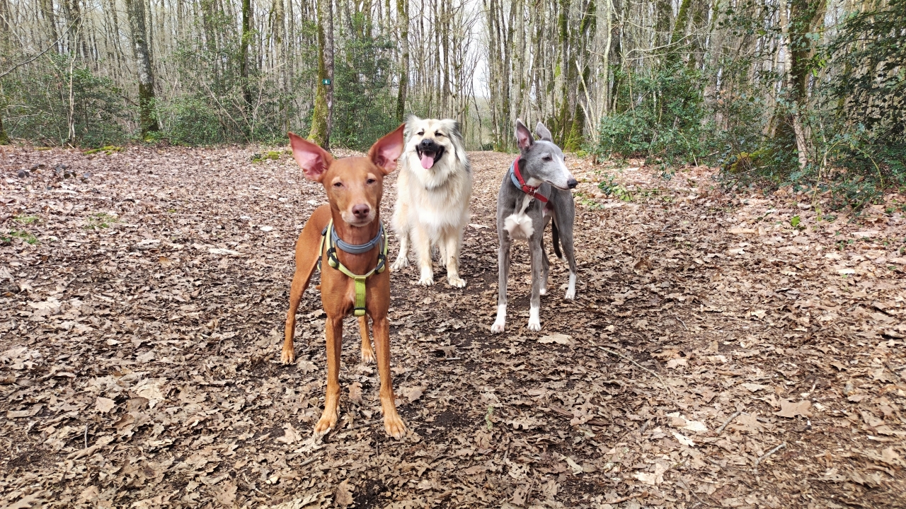 | Dire merci | ![]() ![]() Bon, y'en a toujours un qui se sent pas concerné par la photo. Mais ils sont mignons quand même C'est agréable ce temps plus sec, et les chemins au bois ont bien séché. Les chiens étaient contents de se balader proprement. Même Sirius, pour dire |