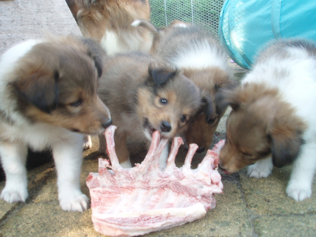 DéconnectéDire merci | Non, c'est vrai... mais cela opère une présélection sur le type d'éleveur et la façon dont il /elle conçoit la santé future de ses produits... et pas que ça finalement quand tu vois les "paquets cadeaux" qu'on t'offre avec l'animal et dont une partie est souvent parfaitement inutile mais à but publicitaire pour la marque d'aliment. Et ce n'est pas une garantie de santé future, évidemment, mais disons qu'en cas de... je ne me dis pas après coup : ah si j'avais fait autrement... certainement en ce qui concerne le vaccin à l'aveugle. Pour le plaisir une photo de mon petit Arthur avec ses frères devant leurs premières côtelettes ![]() |