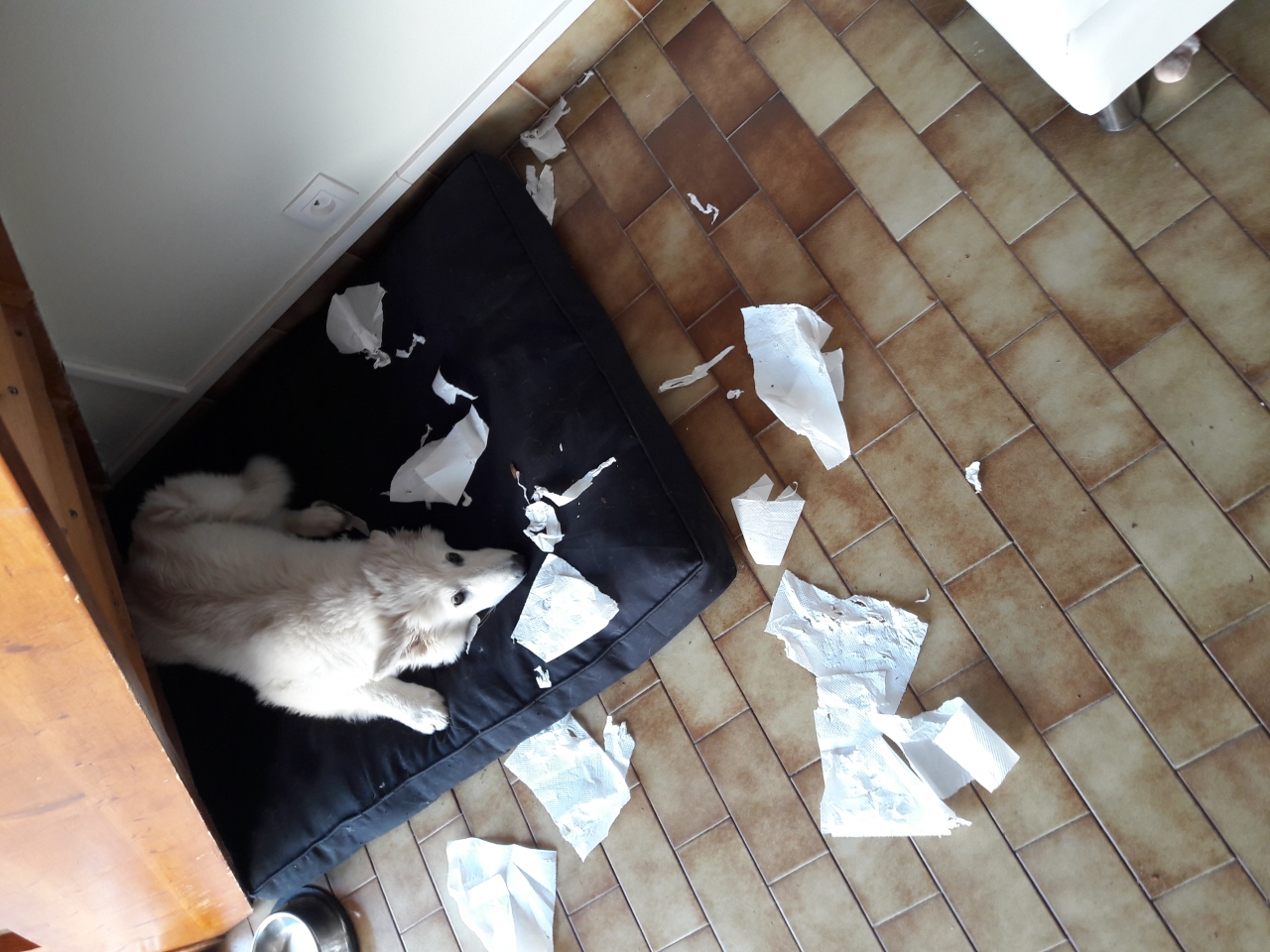 | Dire merci | Ce matin en rentrant du boulot j'ai retrouvé le coussin de ma chienne complètement déchiqueté en je ne sais pas combien de morceaux, elle a du bien s'amuser... Tant pis pour elle, a même le sol ça ira bien parce que racheter des tapis sans cesse ça m'à gonflé !! |