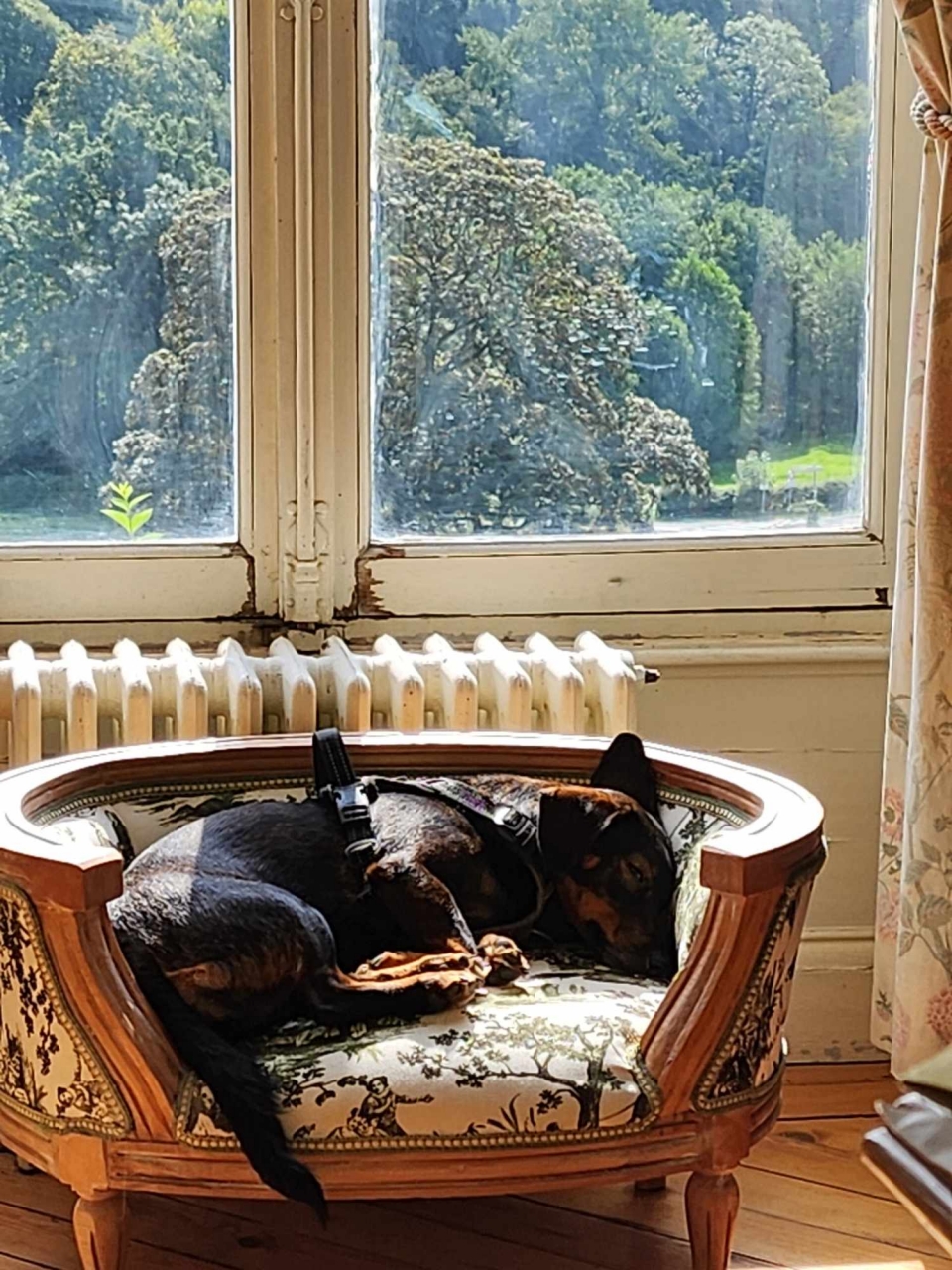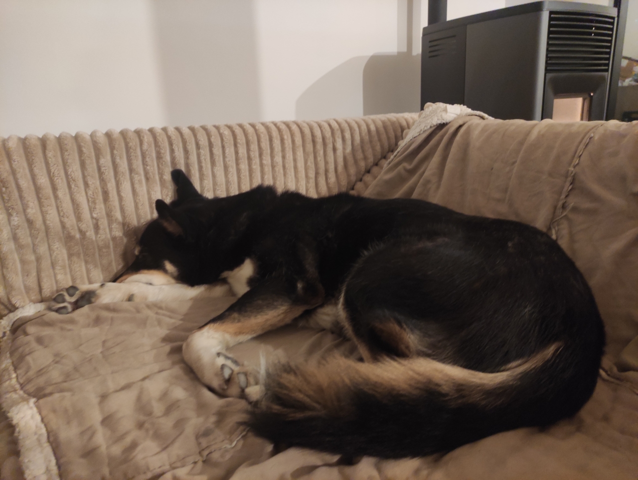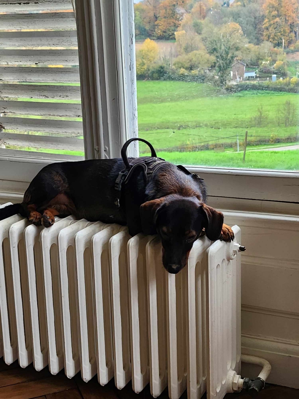 et depuis 2 jours, nous avons un poêle à pellets (on le voit juste derrière)... Gouk est plutôt chien solaire que chien polaire