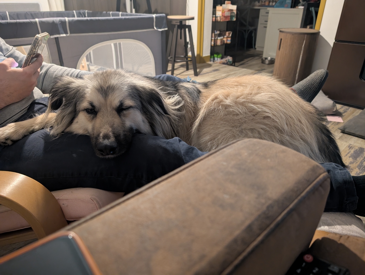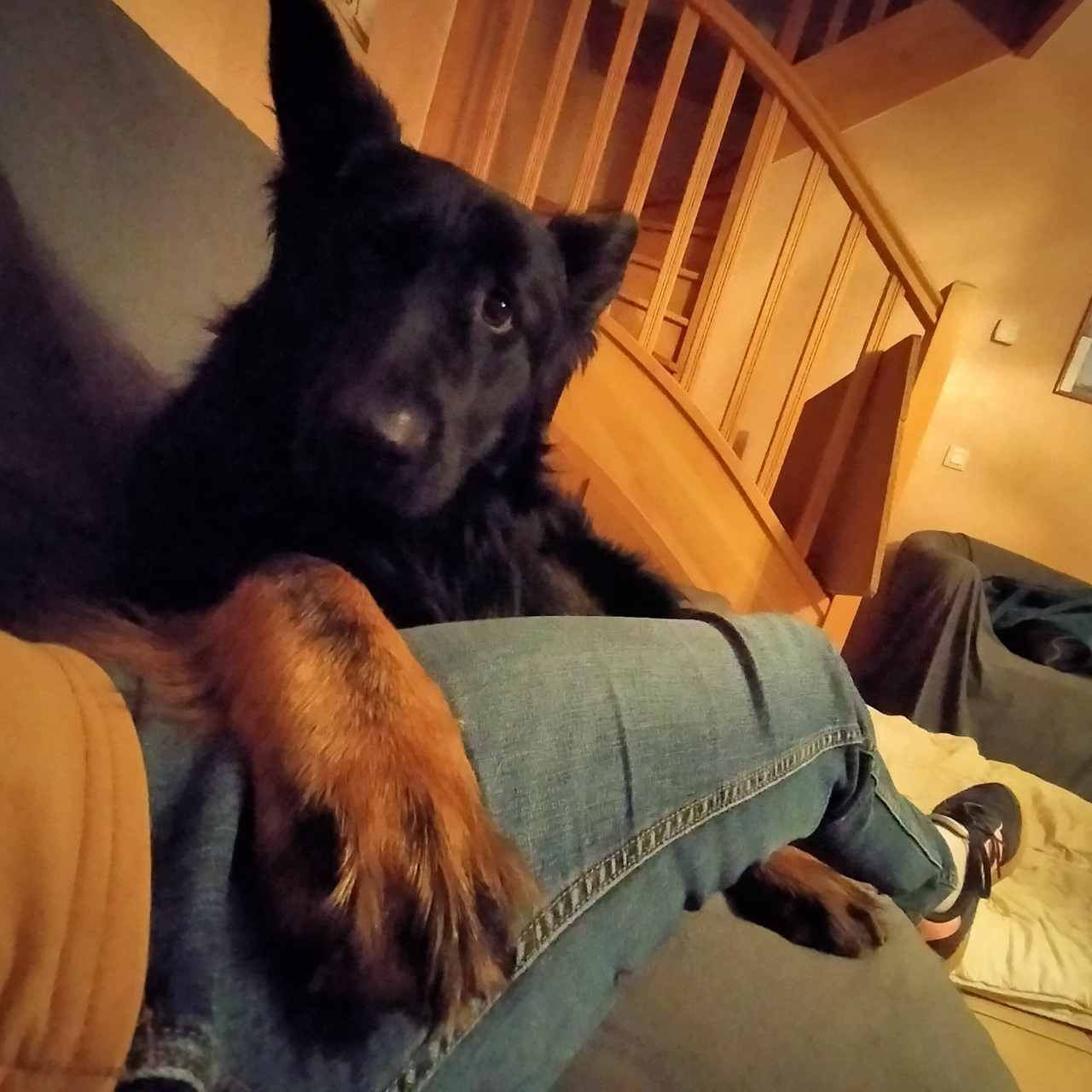 Par contre si on est trop loin de lui, il préfère se mettre à nos pieds. Il est toujours étalé de tout son long sous la table lorsque nous mangeons, il pense faire la taille d'un chihuahua j'pense