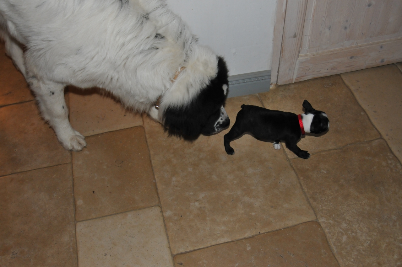 | Dire merci | A l'arrivée d'Epona , 2 mois , je l'ai installée la nuit en cage dans l'entrée avec Descartes. Mais c'etait surtout pour qu'il ne l'écrase pas . ![]() |