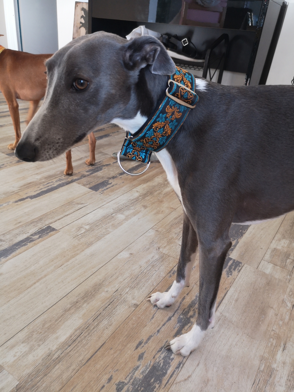 | Dire merci | Après parfois il vaut mieux en prendre des plus larges que d'habitude. Ça le cisaille moins au niveau du cou. Pas trop large non plus pour pas les ettoufer d'un coup. Pour te donner un ordre d'idée, mon podenco cou large mais pas si long que ça comparé à des lévrier à une martingale de 5 cm de largeur. ![]() Mon whippet en a également une de 5 cm ![]() |