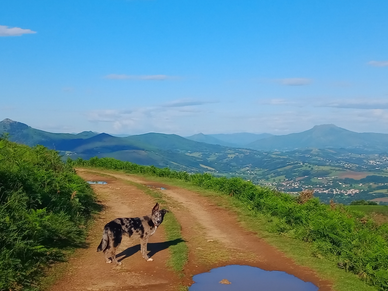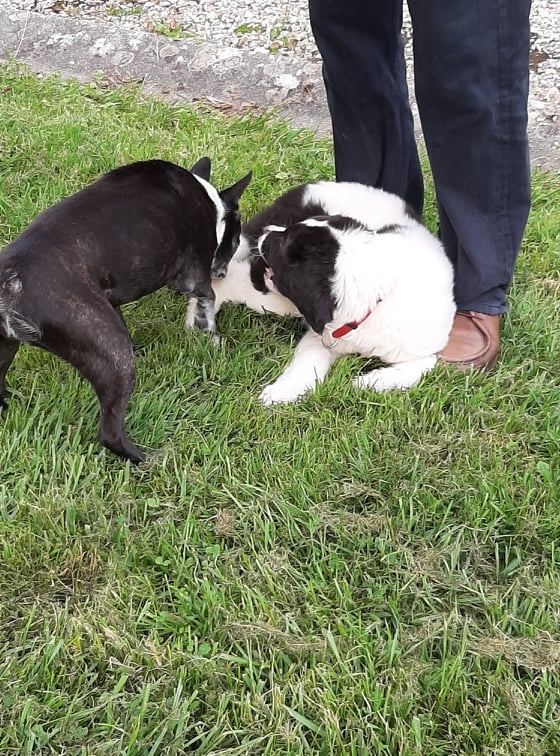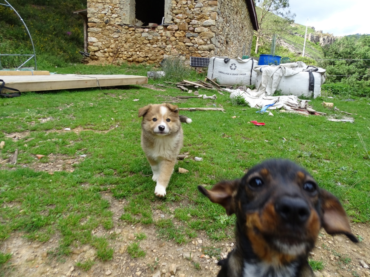 | Dire merci1 | Finalement on a pris un autre chiot pour tenir compagnie à notre Xita, qui s'est très bien faite à la vie à la bergerie avec les poules, mais on avait quand même un peu de peine de la laisser sans congénère humain ou canin toutes ces longues heures... Alors du coup j'en ai profité pour prendre un toutou poilu (parce que j'aime bien ça), qui pourrait aussi nous servir avec les animaux, voici donc Ekain, Border x berger basque Gorbeia. Et qui s'incruste sur la photo (histoire qu'on ne l'oublie pas) ? ![]() |