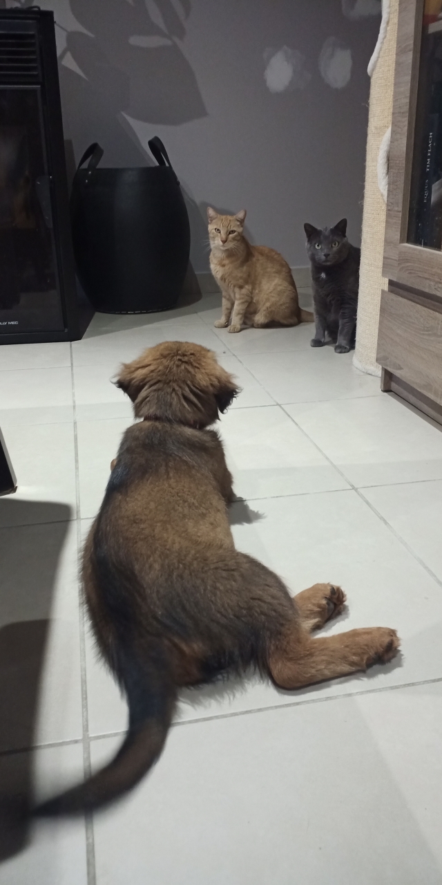 | Dire merci | Belle bouille Stendhal il va être mastoc!!Nous aussi, Saïka est arrivée depuis 1 semaine et demi. C'est une miss crassou, elle préfère rentrer à la maison pour pisser, alors qu'elle vient du jardin Quelques mois à tenir, après la propreté va venir ![]() Avec Jasko le constipé ![]() Saïka contre les félins ![]() |