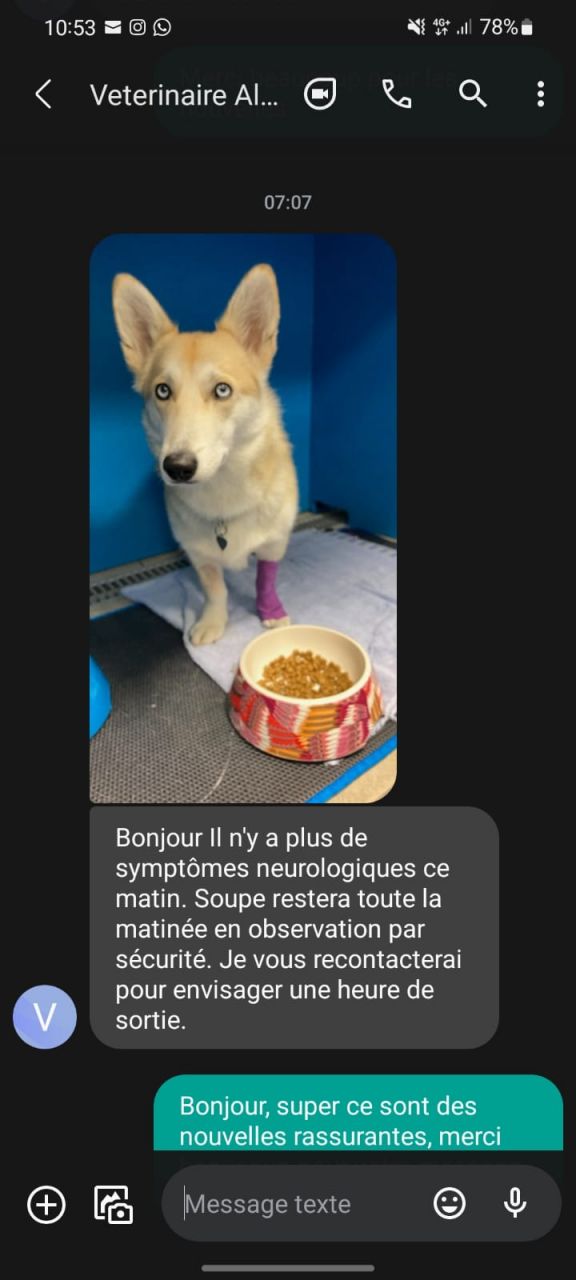 | Dire merci | swann on a retrouvé un carré rose grignoté, donc on suppose que c'est ça, mais on sait pas vraiment. Elle a été perfusée toute la nuit et a eu un traitement, là comme ça je saurais pas dire quoi mais si je retrouve la facture du véto il y a le détail. Dans la chronologie des faits il y a vraiment eu une différence et une grande amélioration au bout de quelques minutes de massage, mais après je sais pas si c'est totalement ça qui l'a aidée. Peut-être que même sans massage elle aurait pu aller mieux ? dur de savoir... |