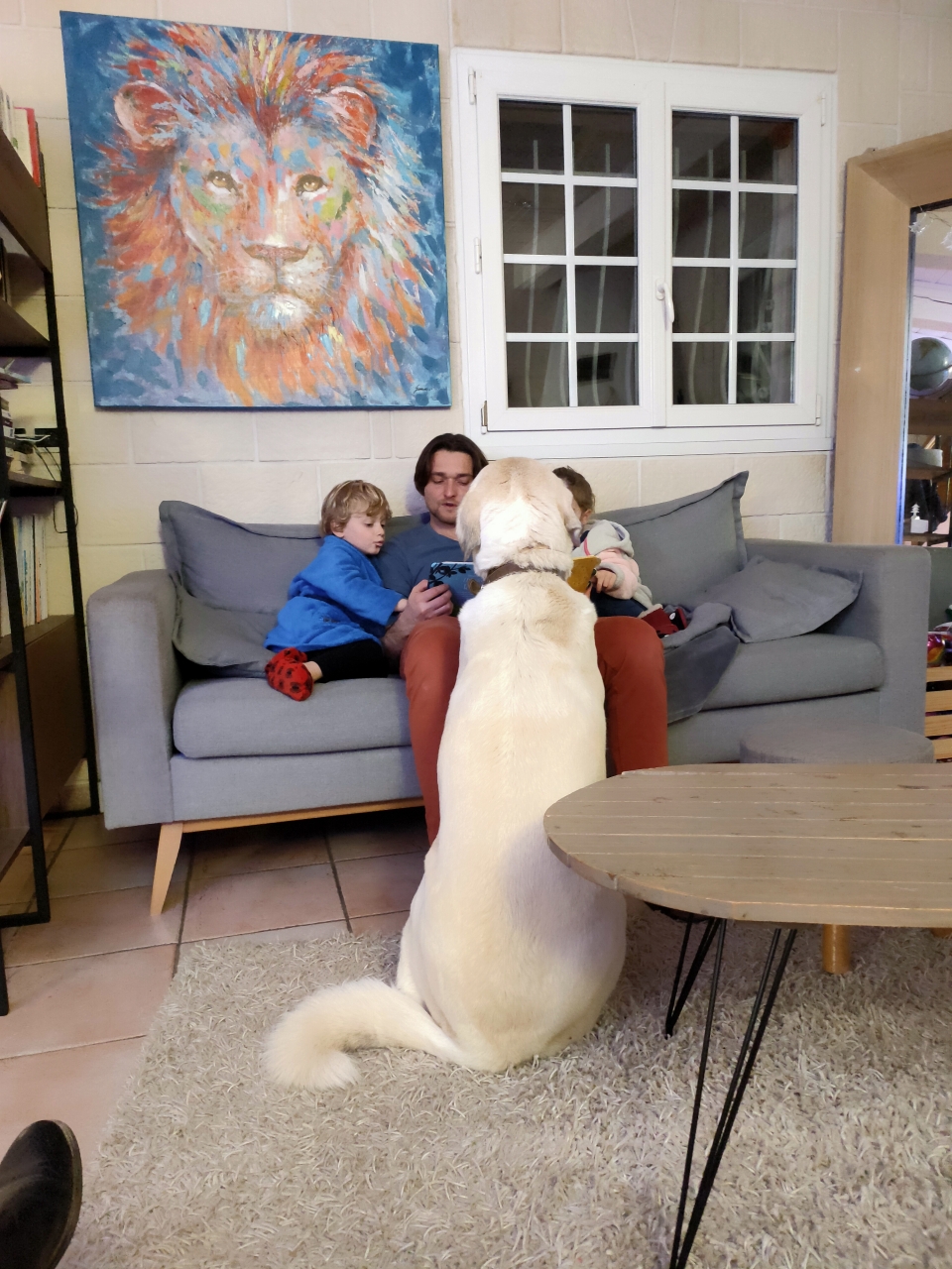 | Dire merci | Je ne sais pas s'ils se battront un jour, mais ce soir Massaï et Arès font dodo dans le même panier, le chiot dans les pattes du grand. C'est mimi ! |