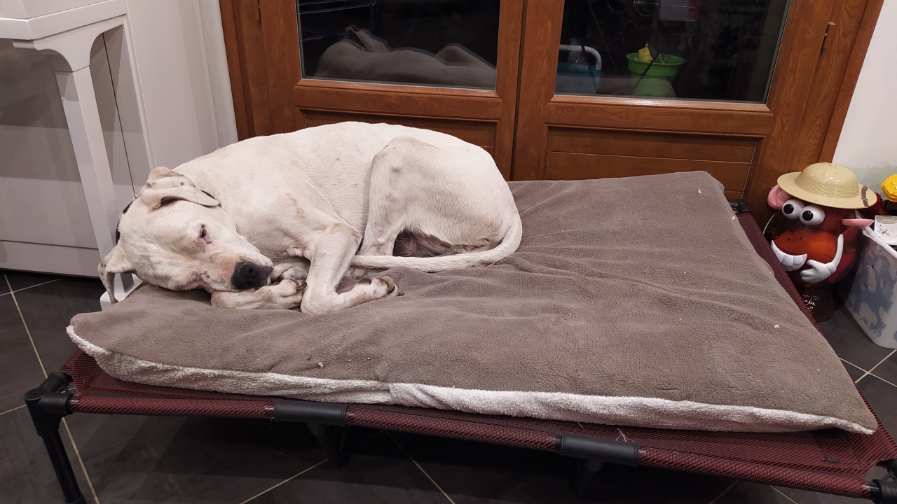 | Dire merci1 | takhan je réagis à ça : "Il est tout rouillé donc les levers sont difficiles..." La mienne a eu aussi ce problème, et les traitements pour l'arthrose + un dodo légèrement surélevé ont pas mal aidé (l'espèce de lit de camp qui est sur mes photos) |