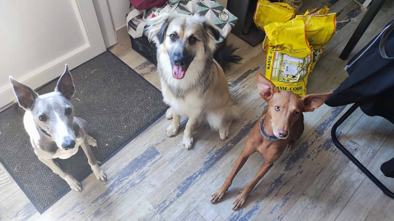 | Dire merci | Le rouquin c'est Girasol et c'est un Podenco. (Et il a gagné x fois sa liberté car il m'a volé plein de chaussettes )Lennon est a gauche, c'est le whippet. |