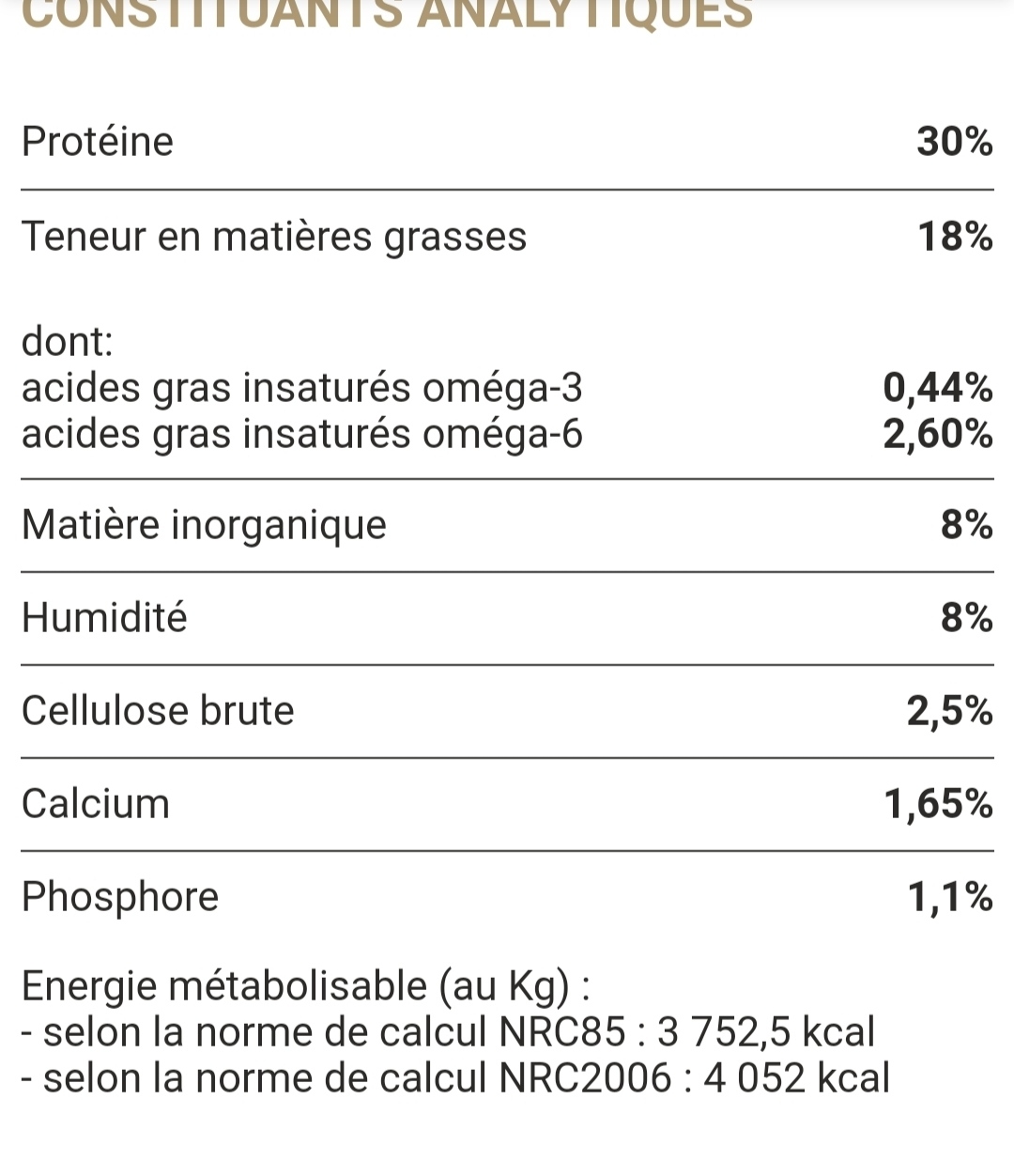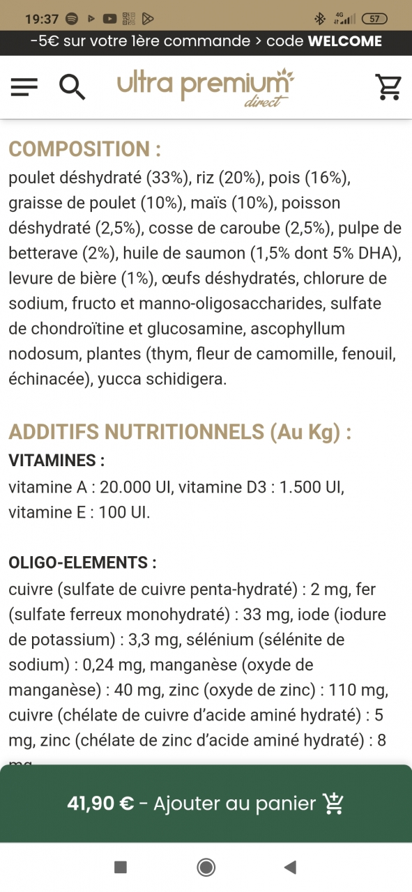 | Dire merci | Hello à vous tous ! Un petit passage sur le forum pour vous faire un petit coucou et venir un peu aux nouvelles de vos poilus ! Vous m'avez donné envie de rester le mantrailing mais encore plus " la recherche dans les décombres en forêt " ça existe ce genre d'activité en vrai ? Je pense que Kaïko accrocherai trop ! Il est bon en pistage...la preuve : le 24 au soir il a pisté l'odeur du chapon qu'un de mes voisins avait sorti de son coffre et posé au sol " en attendant de décharger le reste". Il a échappé à la vigilance de ma mère et a traversé un bout de bois et le grillage au sol du voisin pour aller bouffer la moitié du chapon.... il a réveillonné quoi...Bref je reviens aussi vers vous parce que justement j'ai une question alimentation qui me turlupine... Si mon chien est parti de bonne grâce chez moi voisin c'est parce qu'il y a quelques semaine de ça...alors que je le baladais dans les champs autour de chez moi, ce même voisin qui faisait un repas de famille, ne m'a pas vu, a vu le chien et a décidé qu'il était bcp trop maigre et affamé et s'en est offusqué...pour corriger la situation il l'a fait rentrer chez lui et lui a filé tous les os de poulet cru du repas !! Qd j'ai pu enfin le récupérer j'ai bien-sûr eu droit à " il est tellement maigre, il est affamé, faut le nourrir"... Bon je vous passe tous les trucs qui me sont passés par la tête mais ça me travaille. Je dirai pas qu'il est maigre mais il est fit c'est sur ! On sent pas la colonne mais on voit quand même ses côtes très souvent il y a un bon creux juste derrière sa dernière côte. Il est en pleine forme, très actif et plein d'énergie et de toute manière je souhaite le garder fit. Mais ces côtes apparentes me turlupine et la remarque des voisins aussi. Du coup je me suis dis que ses croquettes ne collaient peut être pas...alors je check un peu et dans mon budget j'ai trouvé un truc qui me semble un peu mieux. Pourriez vous me dire ce que vous en pensez et lesquelles vous préféreriez ? (Je sais que ce n'est pas l'idéal, mais j'ai un budget en ce moment qui me permet que de taper dans ce "milieu de gamme" et impossible de passer au barf aussi). Je précise que dans ses croquettes actuelle la dose recommandée est de 260g pour 30kgs. En ce moment il a plutôt 460gr et semble à peine se maintenir. Je ne pige pas tout car les autres croquettes semblent plus riches et pourtant la dose préconisée est plus grande.... Croquettes actuelles : ![]() ![]() ![]() Croquettes en repérage ![]() ![]() ![]() |