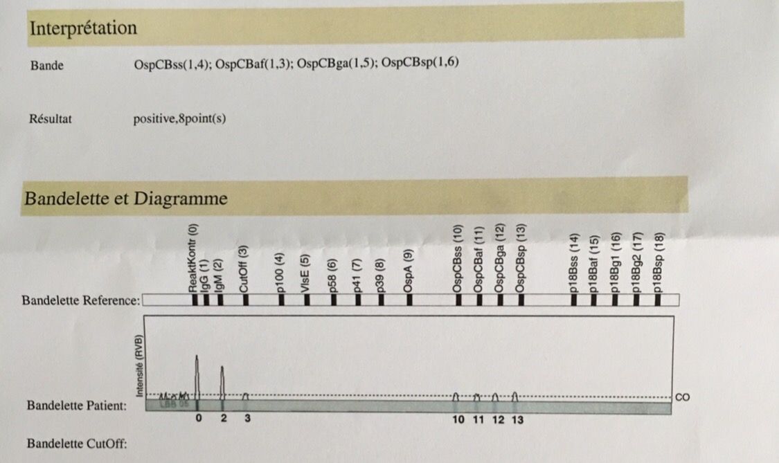 | Dire merci | J'ai eu le résultat : Test ELISA IgG 20,3 IgM 0,5 En 2015 IgG 7,7 et IgM 0,7 Western blot Protéine p100 négatif Protéine Vlse négatif Protéine p58 négatif Protéine p41 négatif Protéine p39 négatif Protéine OspA (p31) négatif Protéine OspC négatif Protéine p18 négatif Quelqu'un pourrait m'expliquer ce résultat ? Bien entendu j'appelle mon médecin traitant dès 14 heures ... |