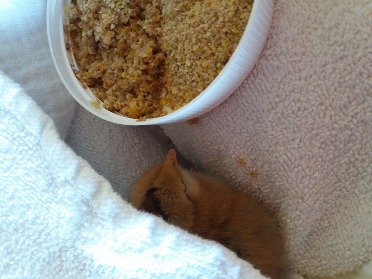 | Dire merci1 | Pourtant il est déjà super glouton! Il reprend des forces, j'ai du lui mettre une caisse plus haute car il saute au dessus de la précédente... Je lui ai créé un système de rideau avec un bout d'essui éponge pour qu'il soit sous une "aile" dans le noir au calme.. |