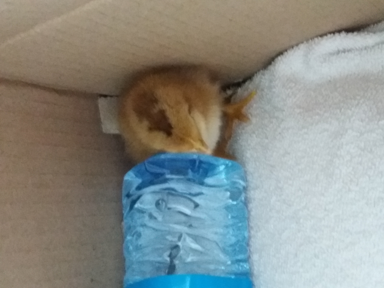 | Dire merci | tu peux vraiment mettre de l'eau chaude dans la bouillotte, sous l'aile d'une poule, il fait bien chaud ! tu ne pourras le réintroduit, s'il survit (aller, gardons l'espoir) que quand ce sera un poulet/poulette |