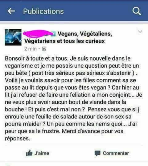 | Dire merci | Bah moi c'est une question que j'avais posée sur mon mur: "le sperme est-il vegan?" J'ai eu beaucoup de réponses |