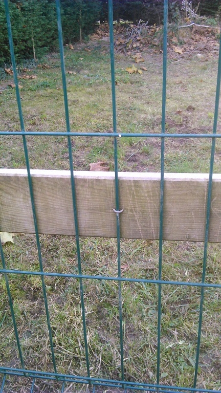 | Dire merci | Détails![]() Fixation du grillage sur les planches de traverse (ce sont des lames de terrasse) par crampillons ![]() ![]() |