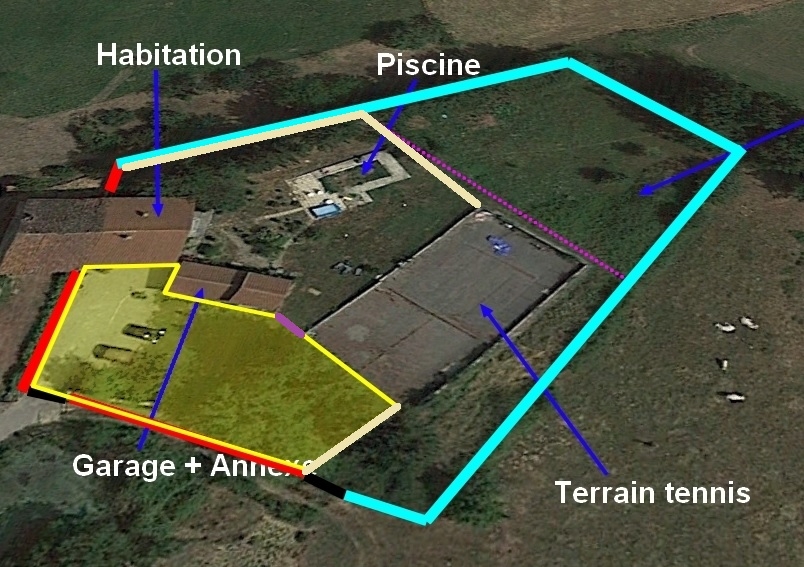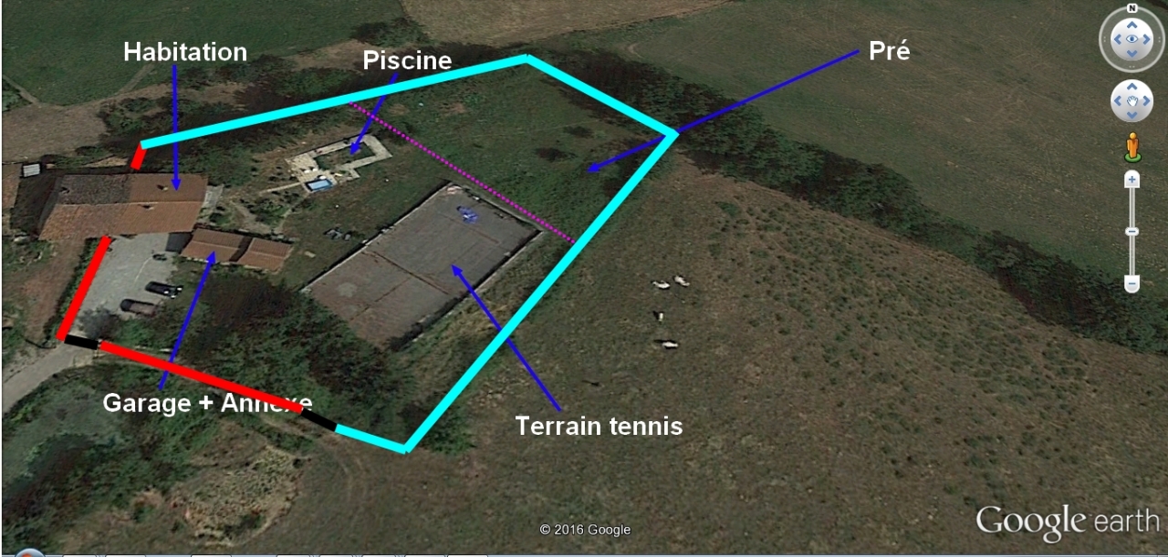 | Dire merci | Alors déjà la situation actuelle En noir les 2 portails, En rouge le muret, En bleu, un ersatz de clôture type barbelé, ou du moins ce qu'il en reste La ligne rose délimite la partie jardin de ce que j'appelle pré (friche avec des petits arbres fruitiers), et qui se matérialise sur place par une grande pente. ![]() |