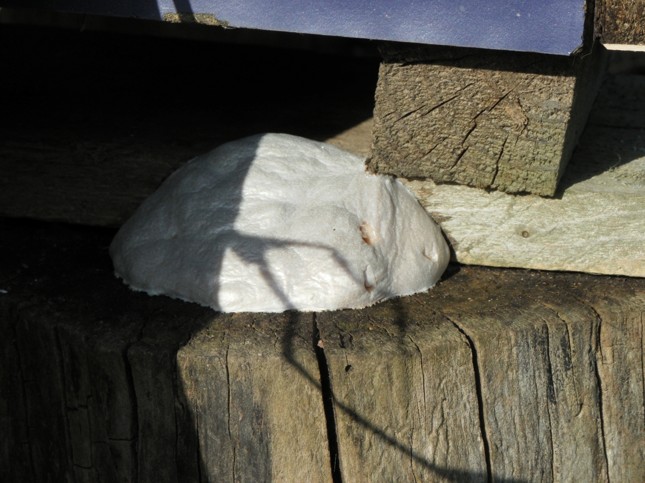 | Dire merci | Petite énigme du jour! Je viens de constater ces trucs-bidules sur 2 des 3 rondins qui soutiennent le poulailler. J'ai piqué le premier avec un petit bâton, ça a une consistance de... meringue molle. Kézako le schmilblick?!![]() ![]() ![]() |
