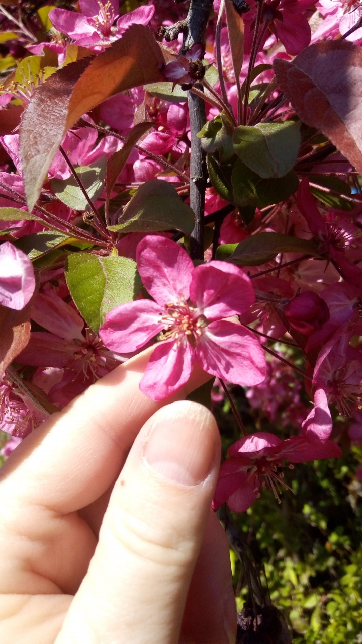 | Dire merci | Bon ca fait la taille de mon pouce aussi les fleurs. Ca y ressemble beaucoup. Et quand je regarde les pommiers, ça y ressemble beaucoup aussi Si j'avais les fruits ça serait plus vite régler. J'en ai trouvé mais des tout rabougris qui donnent rien. J'en ai ouvert un par curiosité. Les feuilles : ![]() Les fleurs de plus près : ![]() ![]() Le fruit décomposé qui du coup, me fait plus penser à une prune qu'à une petit pomme. Mais je ne sais pas à quoi ça ressemble l'intérieur de petites pommes si y'a pépins comme chez les grosses ou non :![]() Je reste pas trop longtemps à tripoter l'arbre y'a plein d'abeilles et de bourdons qui butinent, et j'ai pas envie de les embêter |