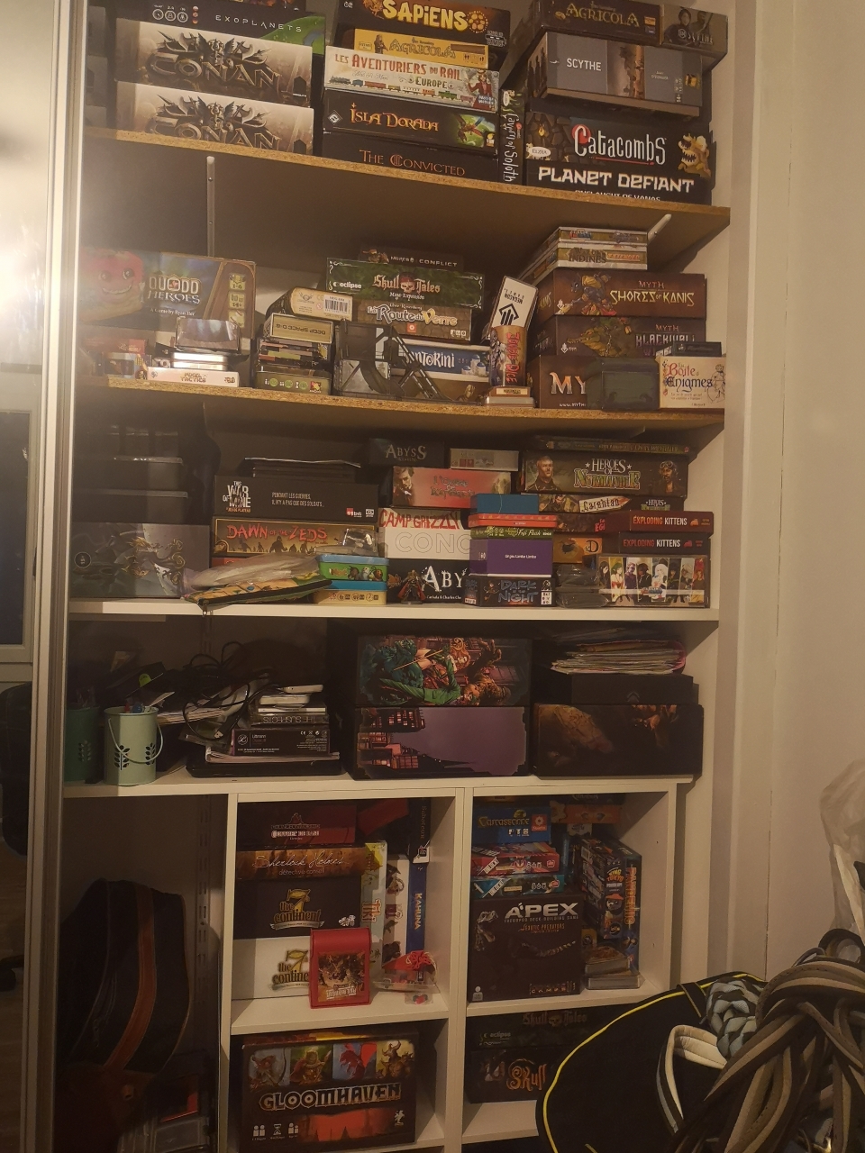 | Dire merci | Six qui prend, skipbo.. En jeux de cartes avec des chiffres. Le but est de faire une suite de nombre. Nous en ce moment, c'est explosing kitten. Les cartes sont marrantes, le but n'est pas de tomber sur une carte de chat qui explose. Y'a des cartes pour éviter de piocher, mélanger la pioche etc... Y'a Kantu, limite limite, blanc manger coco en jeu un peu osé mais faut aimer l'humour noir. Les mystères de l'abbaye sur le principe du cluedo. Mysterium... Sinon je te laisse zoomer sur les boîtes qu'on a... Enfin que mon homme a. Y'a la moitié chez ses parents encore.... Les aventures du rail c'est sympa mais ça peut être un peu long. Pandemic aussi c'est rigolo. Noé en petit jeu aussi. ![]() Message édité le 19/08/19 à 18:20 |