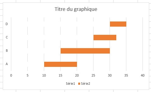 | Dire merci | Pardon, je percute le pb, ca veux dire qu'il faut ajouter une colonne a ton tableau de données. A B C D 1 A 10 20 =(C1-B1) 2 B 15 30 =(C2-B2) 3 C 25 32 =(C3-B3) 4 D 30 35 =(C4-B4) Et tu fais ton graph avec la colonne A B et D |