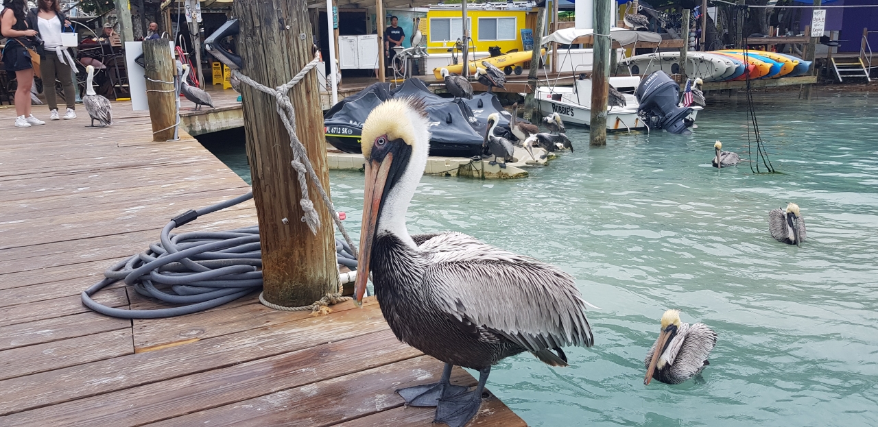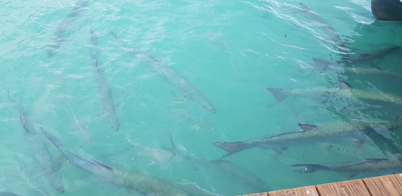 | Dire merci | En chemin, on a été nourrir les tarpons au ponton de Robbie. Robbie a soigné un tarpon ds les années 74 et l'a relaché, L'année d'apres, "Scarface" est revenu avec deux potes , puis 200 potes l'année suivante Depuis ils sont là, et font la joie des touristes , se disputant la bouffe avec les pélicans, omni présents . inutile de songer à se baigner ds ce coin ![]() ![]() ![]() ![]() |
