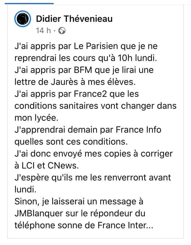 Déconnecté | Moi je dois ressentir la même colère que les soignants au mois de mars quand ils soignaient avec des masques de plongée...parce que les mesures sanitaires même ''renforcées'' en milieu scolaire c'est une vaste blague. Qu'on y prenne des risques, c'est déjà angoissant, qu'on fasse croire que les profs et les gosses sont en sécurité parce que Blanquer dort sur ses deux oreilles, c'est proprement révoltant |
