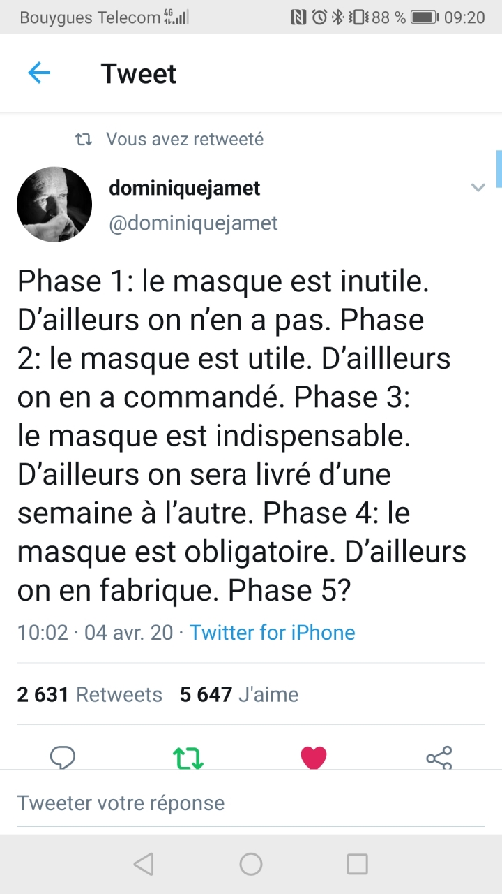 | Dire merci1 | le problème c’est que j’ai l’impression que nos gouvernants n’ont pas de ligne directrice. Ils vont au fur et à mesure des effets d’annonce. Ca me semble logique que le gouvernement navigue a vue. Ils sont d'ailleurs assez transparent la dessus. Ils voient comment ca évolue et adapte en fonction. Comment veux tu faire autrement? Quand aux masques, heureusement qu'ils ont dit au départ que ca n'était pas utile. Quand on voit le délire sur le PQ, les pates, et autres... Si au départ ils avaient dit "les masques vont sauver des vies, mais on n'en a pas assez" ca aurait été la débandade. |