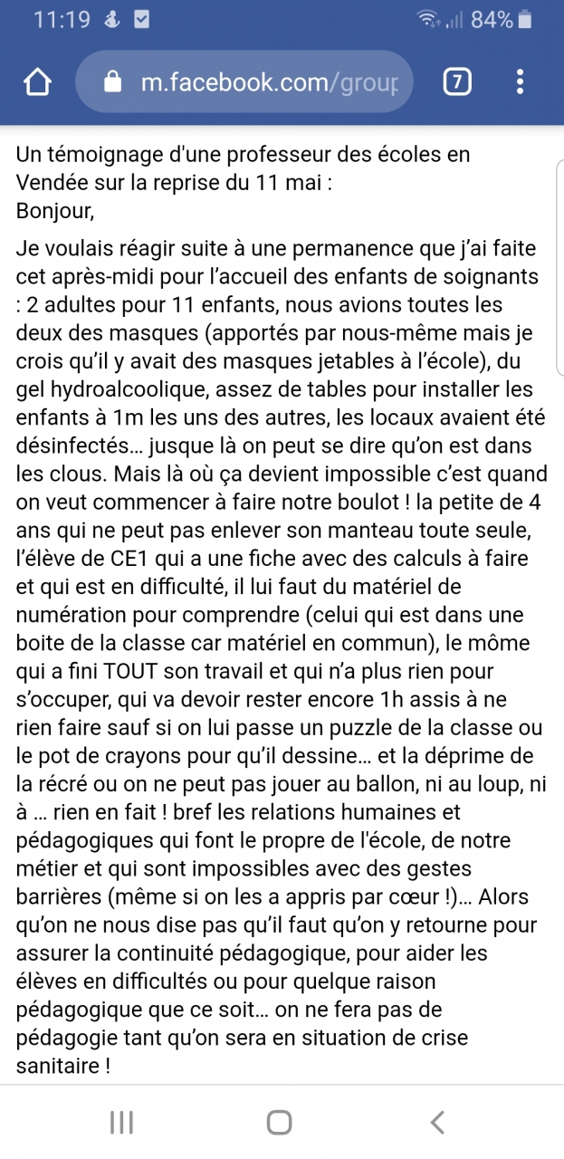 | Dire merci1 | Mais ça on le sait déjà paquerette20 Hantant ecoles ou colleges ou lycées , avec vision claire de la configuration de nos etablissements, contrairement aux parents, nous sommes parfaitement conscients des casse tete que constituent distanciation sociale ,matériel commun etc facebook regorge de témoignages de profs qui ont assuré par ex l’accueil des enfants des soignants ds des conditions idéales et se sont arrachés les cheveux au bout de 10 minutes alors même qu'ils etaient 3 adultes pour 10, 15 gamins |