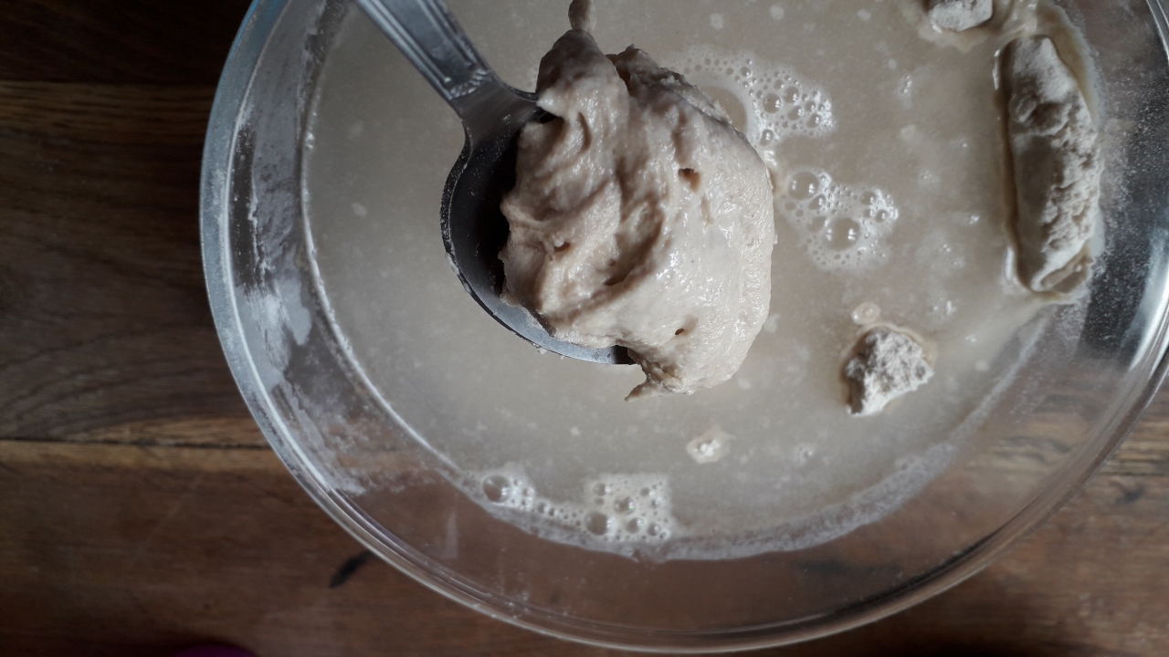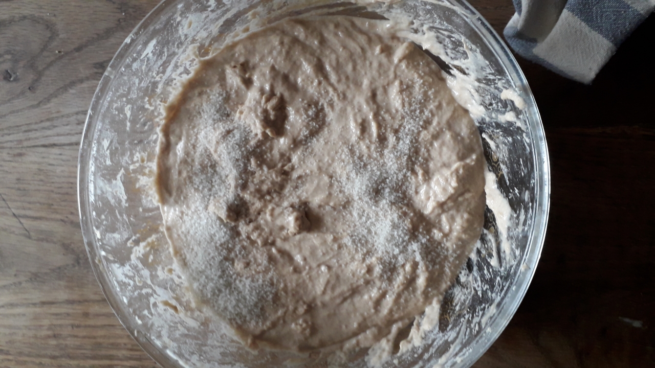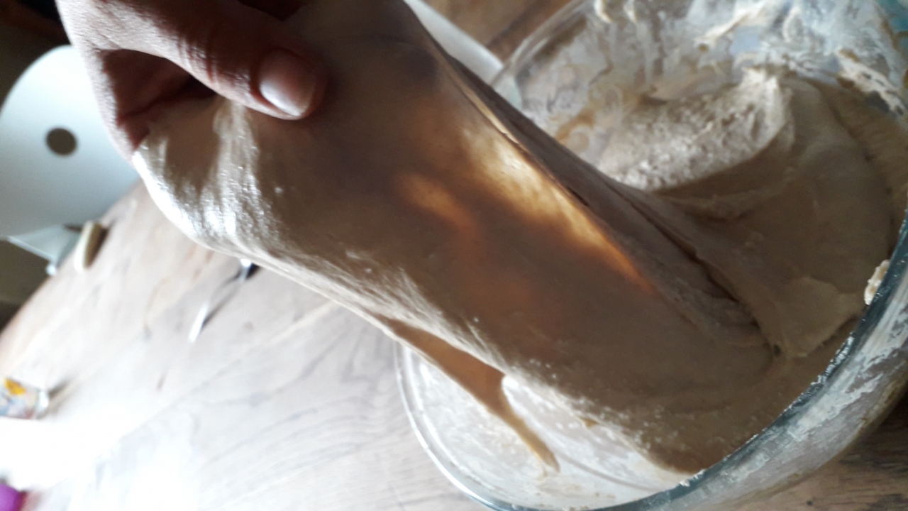 | Dire merci | Bon voilà j’ai ajouté le levain qui était semai-liquide/pâteux. Et la pâte qui était top et devenu toute pâteuse j’en ai à nouveau eu plein les doigts! Je laisse une heure au repos avant de mettre le sel. |