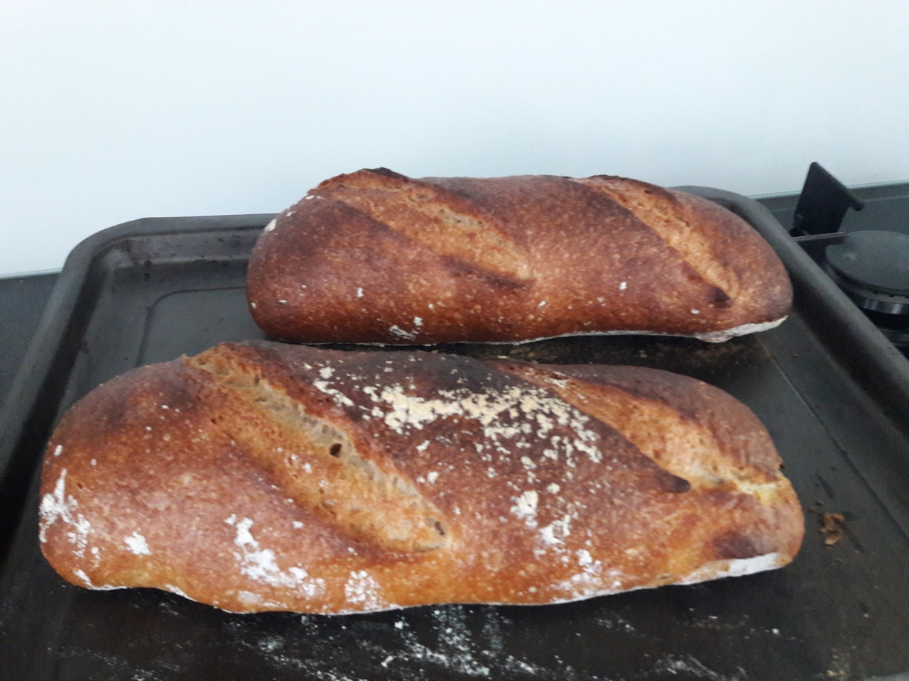 | Dire merci | ![]() Mon levain commence à être efficace. Je m'en sers tous les 2-3j alors je le rafraichis assez souvent. Il devient costaud. Pain avec 400g de farine complète et 100g de t55. Levain farine t55. Si je fais tout à la farine complète j'obtiens une brique. |