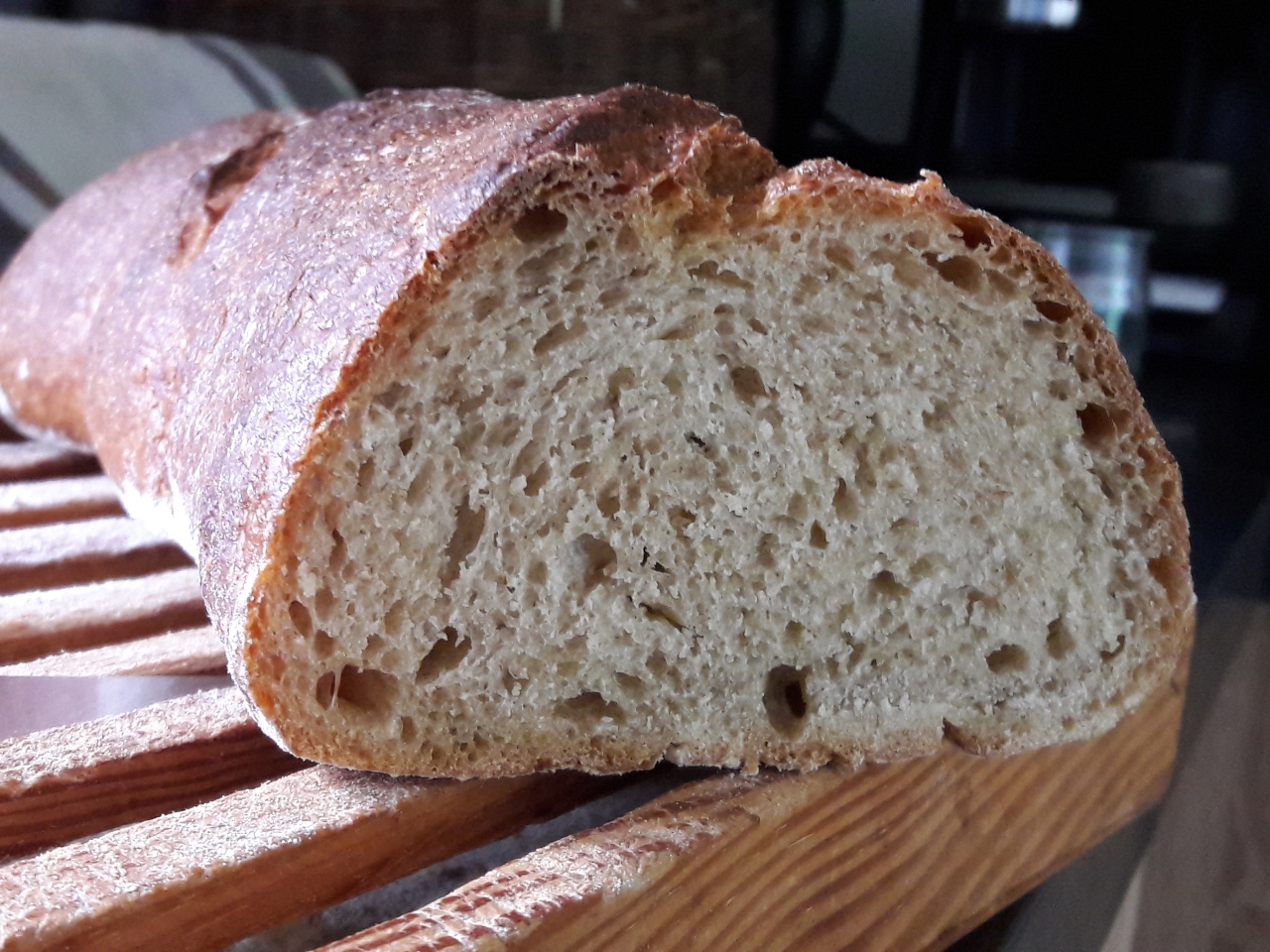 | Dire merci | La farine complète ne fait pas un pain très aéré non plus. Le mien est plutôt dense mais ça nous va bien comme ça. Mon mari arrive à mettre plus de confiture dessus. |