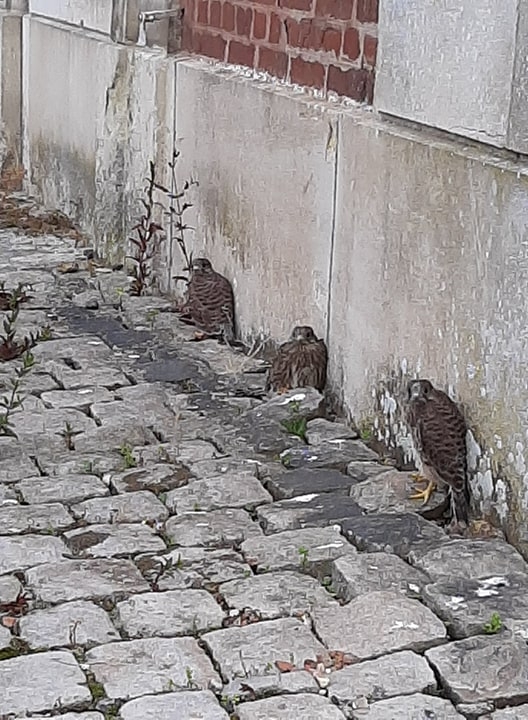 | Dire merci | Les 5 bébés faucon sont toujours vivants , 2 au nid et trois par terre , ils deviennent plus habile et arrivent à se percher un peu . Je les repère à leurs cris et en observant ou atterrissent les parents. |