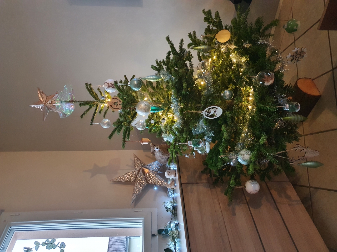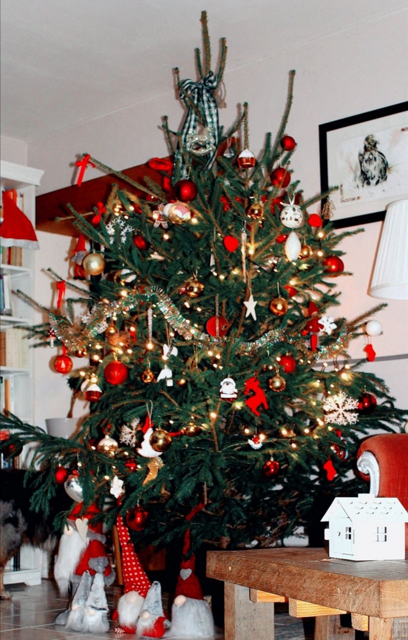 | Dire merci | ![]() Nous c'est un sapin artificiel qui a 18ans et qui fait le job. La deco c'est rouge et blanc avec du bois. |