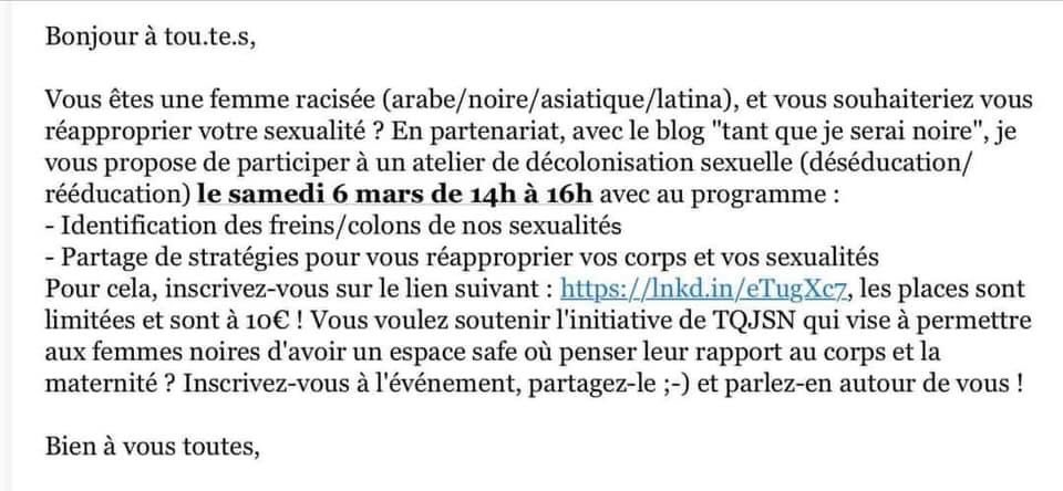 Déconnecté | Je ne sais pas pourquoi on a ce besoin irrépressible d’importer toutes les m**** américaines ![]() Sur Twitter pas mal de noirs témoignent, ceux qui défendent la France se font détruire par les racialistes. Une femme formidable qui vient de sortir un livre sur le sujet: « Racée », Rachel Khan. Elle va devoir affronter les foudres de l’enfer. Lien Message édité le 16/03/21 à 09:42 |