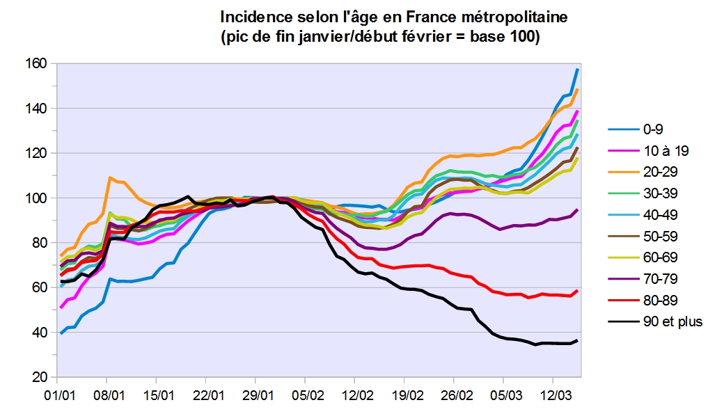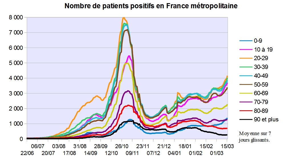| Dire merci1 | Point contaminations par tranches d'âge Incidence par région admissions en réa / région Ces deux dernières semaines, entre le 4 et le 18 mars, on a recensé 3879 décès (hôpital + Ehpad), soit en moyenne 277 par jour. Seule bonne nouvelle de la période, les décès en Ehpad ont donc diminué à ~25 par jour. |