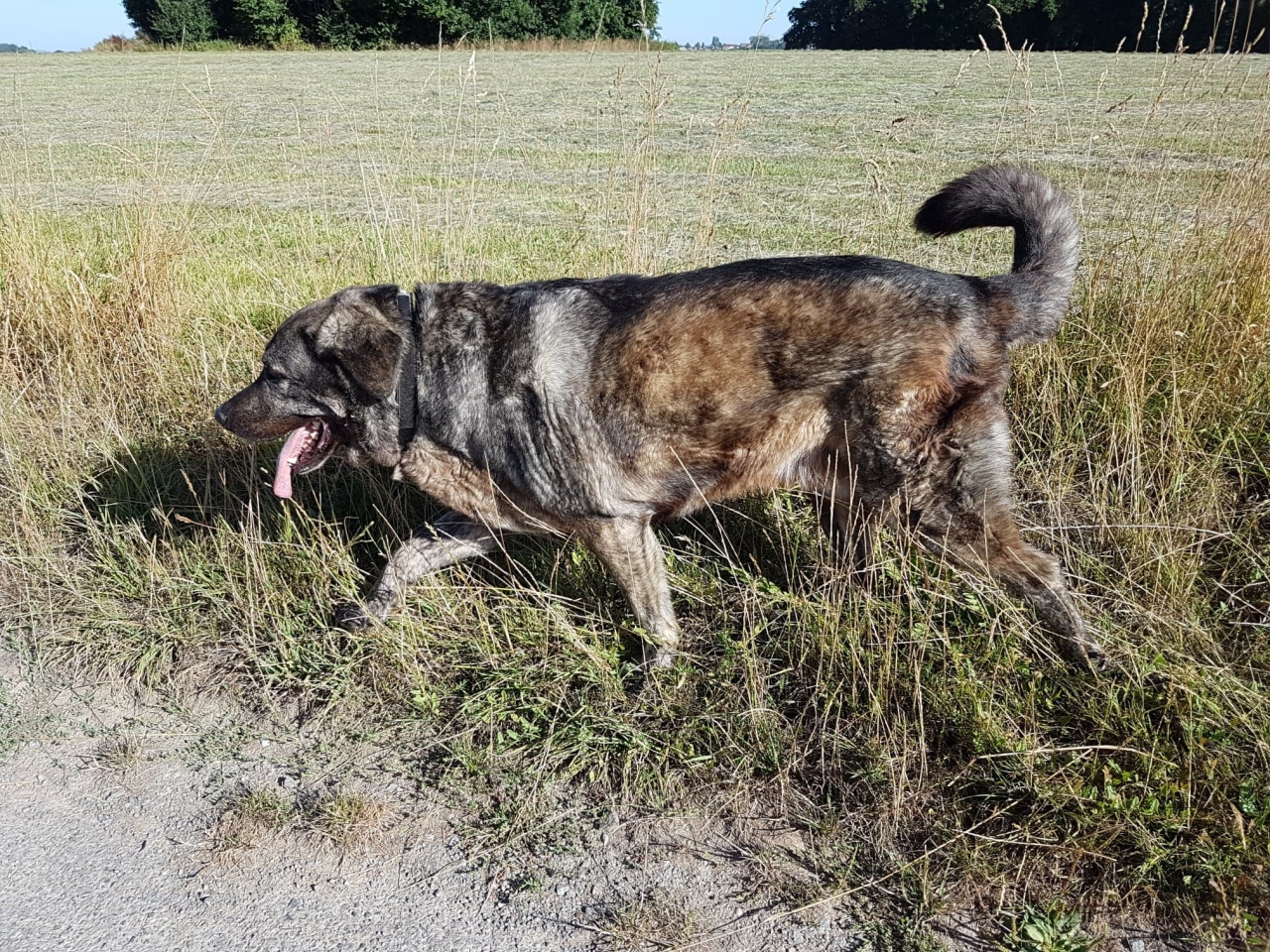 DéconnectéDire merci | voilà, ça fait un an qu'il est là mon gros Mastin et c'est vraiment une aventure un peu hors du commun. C'est très étrange comme chien, par exemple ça ne fait qu'un mois qu'il bouge vaguement la queue quand il me voit ou que je lui parle. Tous les autres chiens me faisaient/font la fête le matin au réveil ou quand je rentre ou simplement quand je leur parle, lui pas ... La seule chose où il montre clairement qu'il est content c'est la promenade du matin et un Mastin qui veut aller promener il pousse avec sa tête dans tes fesses pour te faire aller plus vite ![]() Il adore tous les humains et met un point d'honneur à se précipiter vers tout le monde 'juste pour dire bonjour'. Il est brave avec tous les autres animaux dans le sens où il les calcule pas, oiseau, chat, lapin, vache, chevaux RAB. Avec les autres chiens s'il est en liberté il est parfait, en laisse ça dépend un peu des têtes et de la réaction de l'autre chien. Mais il déteste les border ... J'ai réussi à mettre en place 2 ou 3 'instructions' (je n'ose même pas parler d'ordre tellement la réponse est minimaliste). J'ai trouvé 3 groupes FB de Mastins (anglais et Hollandais) et tout le monde dit la même chose 'ils ont des bananes dans les oreilles qui les rendent sourds', ils sont éternellement dans le chemin et ça résume bien la race. Bref je ne regrette rien, c'est un BON chien, un peu particulier, qui pèse maintenant 72kg et pourtant mange moins que mon regretté BA de 45 kg. Mais c'est clair qu'en dehors de la promenade d'une heure( qui est son max absolu) il passe son temps à dormir quand il n’aboie pas sur une mouche qui pète ![]() ![]() e. |