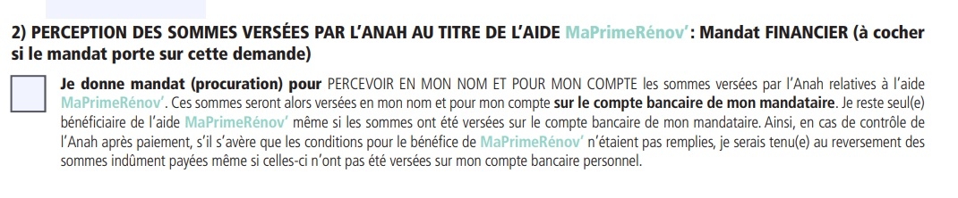 | Dire merci | Ca a été un peu beaucoup mon boulot il y a encore peu de temps. Bref, c'est une procédure normale MAIS après l'établissement du devis. Mandater une entreprise est tout à fait possible mais pas obligatoire. Le bénéficiaire peut faire les démarche lui meme. Le fait de dire qu'il faut signer le mandat avant l'établissement du devis me ferait fuir. Même si ca pourrait être pire en demandant de signer un mandat financier ET administratif. Bref, il faut demander d'autres devis parce que là, ca pue. |