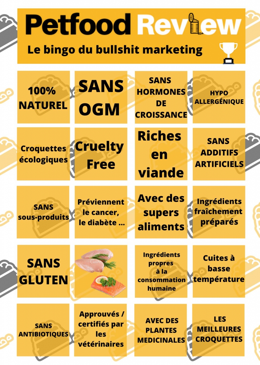 | Dire merci | "sans sous produit" est également un terme marketing mensonger. D'un point de vue légal tout aliment partant vers le petfood est appelé "sous produit", donc même si il y a du filet ou du steak dedans la mention sera toujours mensongère. D'un point de vue plus pratique et environnemental, heureusement que les industriels de la petfood utilisent les bas morceaux restants. Au moins une carcasse sert entièrement, pas de gâchis! |