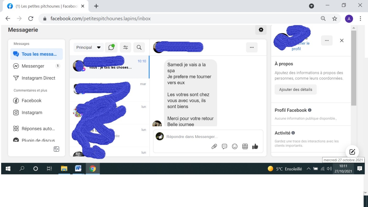 | Dire merci | Bonjour, J'ai discuté avec une futur adoptante sur les animaux que j'ai actuellement à l'adoption. Elle en voulait 2 non compatibles entre eux, je lui indique que le duo qu'elle souhaite faire n'est pas possible et pourquoi et je lui indique ceux qui sont possible. ça laisse encore le choix parmi environ 25 animaux; Nous continuons de discuter sur le fait que je sois bien une association, sur le fait que je fais des sauvetages et d'où sont issus les lapins que je propose et notamment les bébés (j'ai eu des naissances chez moi). Je précise que les animaux sont accueillis chez moi et chez un proche, en famille d'accueil et non en boxe, que je n'ai pas le même fonctionnement que les refuges. Mais que du coup, je teste le caractère de chaque animal, etc. Et voici ce que je reçois ce matin : ![]() bon déjà, elle ne va pas aller en animalerie, ce qui est bien; Mais vous n'imaginez pas comment ce genre de réponse me fais mal. |