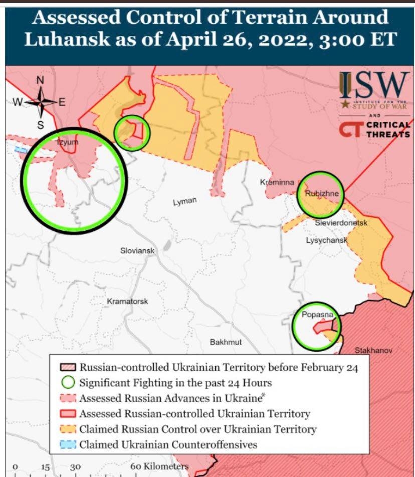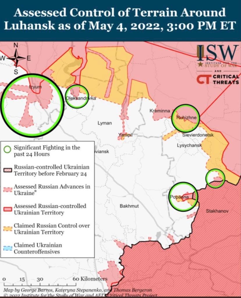 | Dire merci | Merci pour ce retour, mais... ... elles sont bizarres ces cartes (ou alors, je dois reprendre du café). Sur les cartes à l'échelle du pays, ont voit qu'au 24 avril, toute la zone à l'Est de Kramatorsk est contestée mais plus au 4 mai. Par contre, sur les cartes qui font un zoom sur ce secteur, aux mêmes dates, ça ne bouge quasiment pas. |