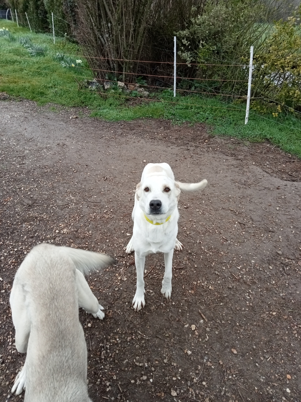 | Dire merci | Donc si quelqu'un est intéressé voici J, croisée kangal Patou de quatre ans, stérilisée. (photo très moche je l'ai prise vite fait tt à l'heure mais elle se tortillait tellement de joie que c'était pas simple) |
