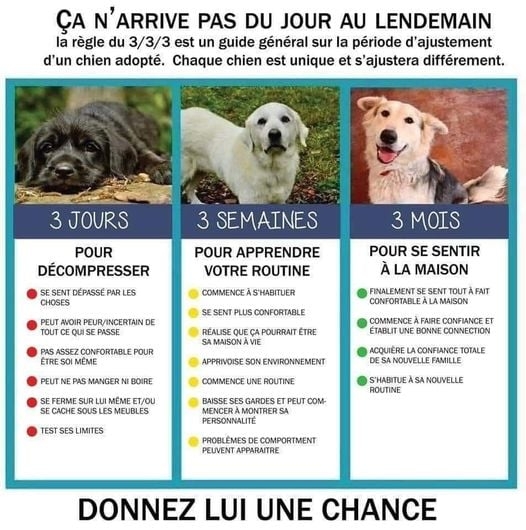 | Dire merci | Il a une bonne bouille Laissez vous le temps de vous acclimater a l'un et l'autre aussi. Tu verras des signes tranquillement. Il y a la théorie d'adaptation des 3 jours, 3 semaines, 3 mois.... Également. Ça reste théorique, on est sur du vivant, ça varie en fonction de chacun. Mon dernier chiot grattait la porte du bureau pour réclamer à sortir, c'était une nouveauté |