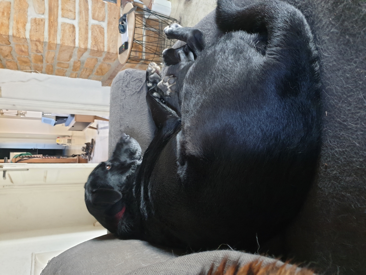 | Dire merci | Misere Je me bats depuis 8 ans avec la mienne pour la faire regulierement descendre de canapes,,lits fauteuils etc. Je peux difficilement lui interdire l etage puisqu on y a notre deuxieme salon et qu elle vit aussi dans la maison. Mais ,je ne la veux pas dans les chambres et je n autorise que la mienne aux 3 chats qui revent evidemment de squatter les 3 autres. Niveau menage,je fais tourner tous les jours 2 roomba en.bas et un dyson avec mes petits bras en haut qui me prouvent que non ,c pas propre ,même si ça le semble. Le pire ce sont les petites étoiles de papattes félines ,témoignages de la putain de poussiere de la mort qui perdure ds l air apres mes 6 mois de travaux. Jing dort ds la buanderie |