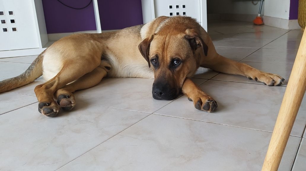 DéconnectéDire merci | Il est vraiment superbe, on dirait un croisement ridgeback x boxer. On se trompe souvent sur les chiens actifs en se disant qu'il faut absolument qu'ils se dépensent et jouent bcp, or rien n'est moins vrai, il faut surtout qu'ils apprennent le calme et les promenades au pas sont excellentes. Il est aussi essentiel qu'il ait qqchse à mâchouiller c'est déstressant donc soit tu lui donnes, soit il va chercher lui même ce qui pourrait l'occuper ;-) Tu as l'air de très bien t'en sortir. Attention avec poules et chat, il faut surtout travailler cet aspect sinon il risque d'y avoir un accident tragique. |
