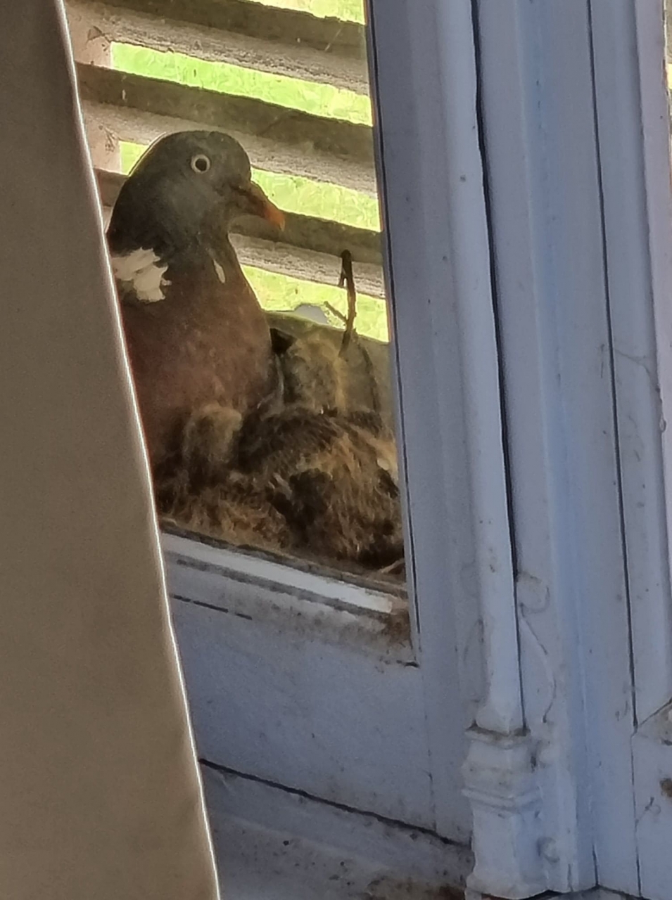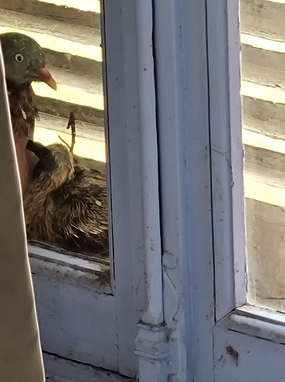 | Dire merci | De ce que j'ai lu , avant , les ramiers nichaient dans les arbres . Il se sont adaptés Par contre , l'année derniere , elle avait niché au meme endroit , mais le volet etait ouvert , et il ne restait qu'un pigeonneau dans le nid , je pense qu'un des deux etait passé par dessus bord. Donc cette année , j'ai maintenu le volet fermé. |