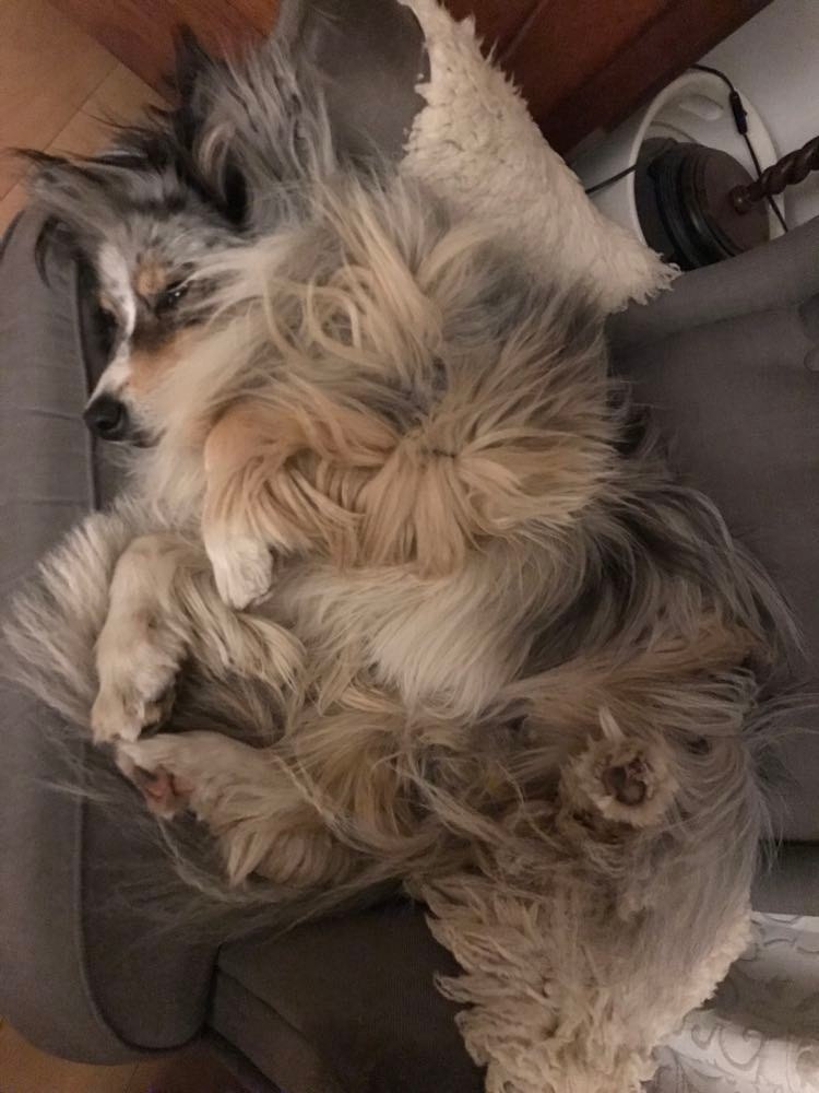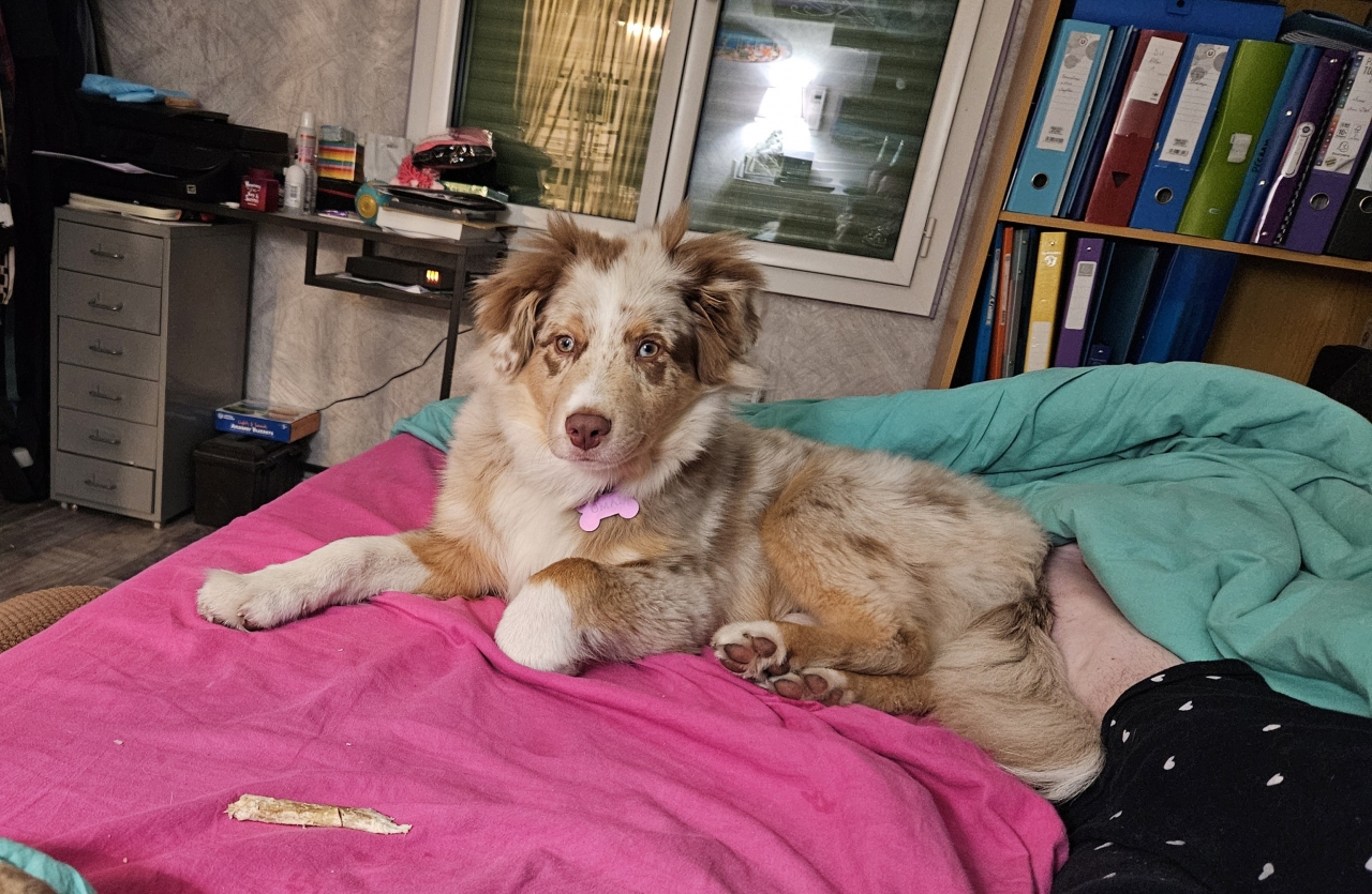 | Dire merci | Ah j'ai pas vu qu'il avait du aussie aussi, je comprend mieux sa tête. Je cherchais le labrador .... Et le merle faisait pas trop celui du beauceron (qu'on dit arlequin plutôt non ?) Après les robes de chiens, c'est pas le truc que je retiens le plus. |